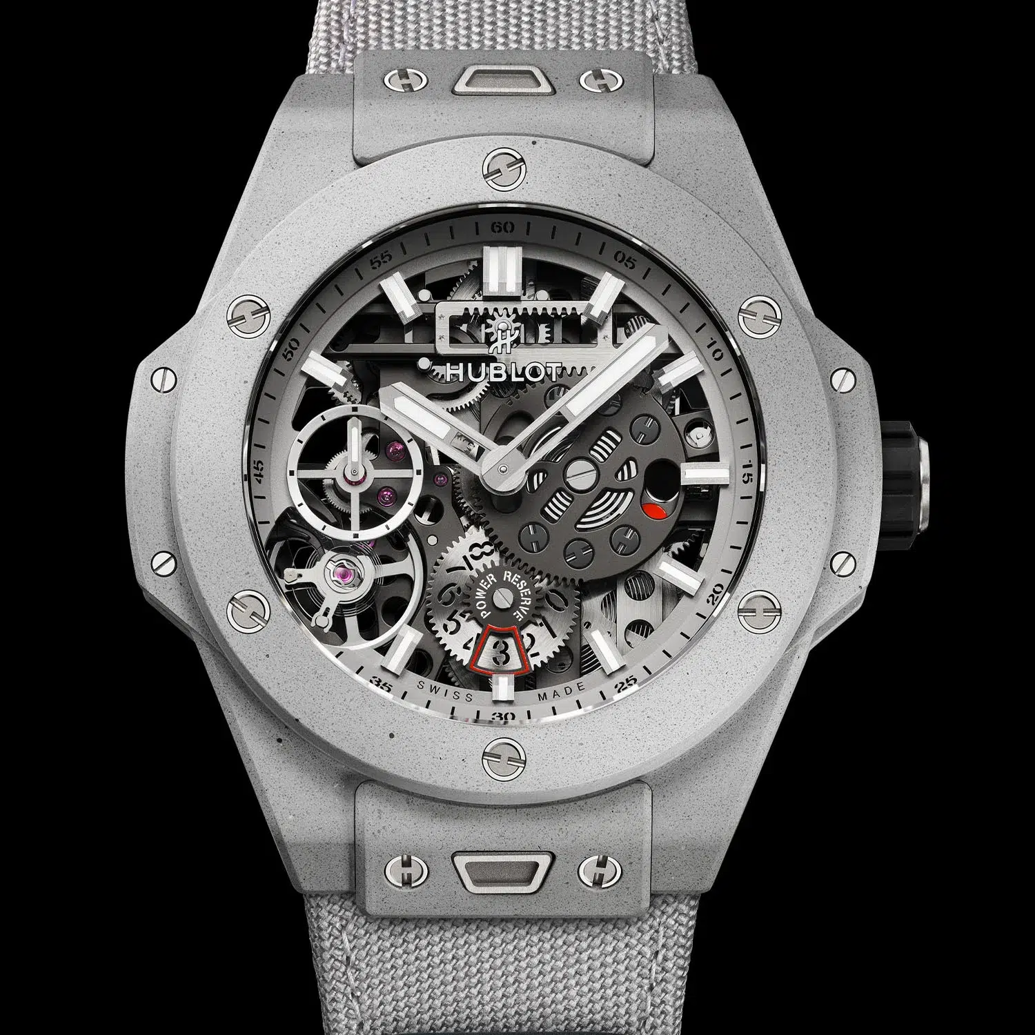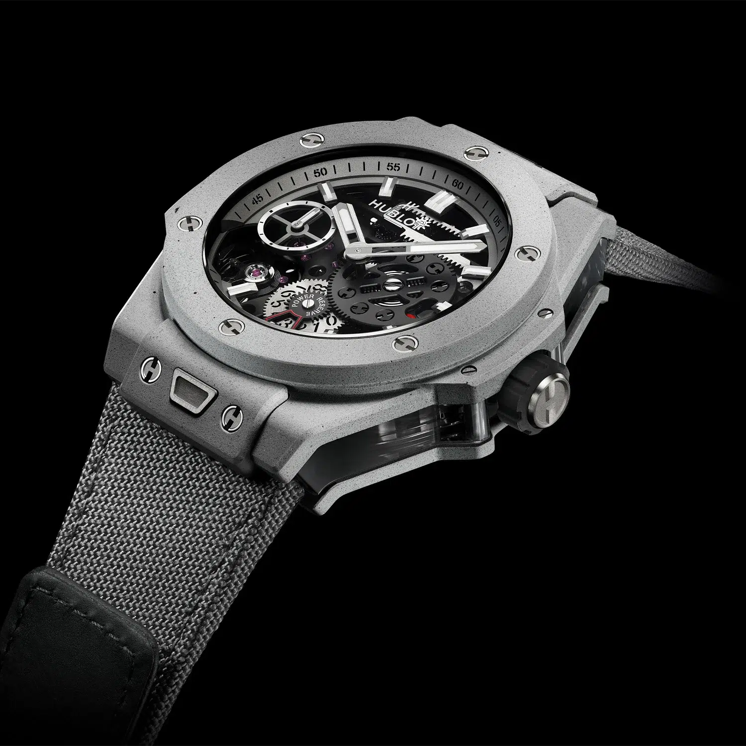 The 44mm x 15.3mm case is constructed from a bespoke concrete blend, specifically cooked up for wearable durability. It’s not your average sidewalk scrap. Instead of water, epoxy resin binds the mix, with fiberglass stepping in for steel reinforcement. To fend off sun-bleaching and grime, anti-UV and anti-graffiti treatments have been baked into the surface. Titanium is used sparingly, appearing on the caseback, crown and the brand’s hallmark H-shaped screws. The water resistance is 50 meters.