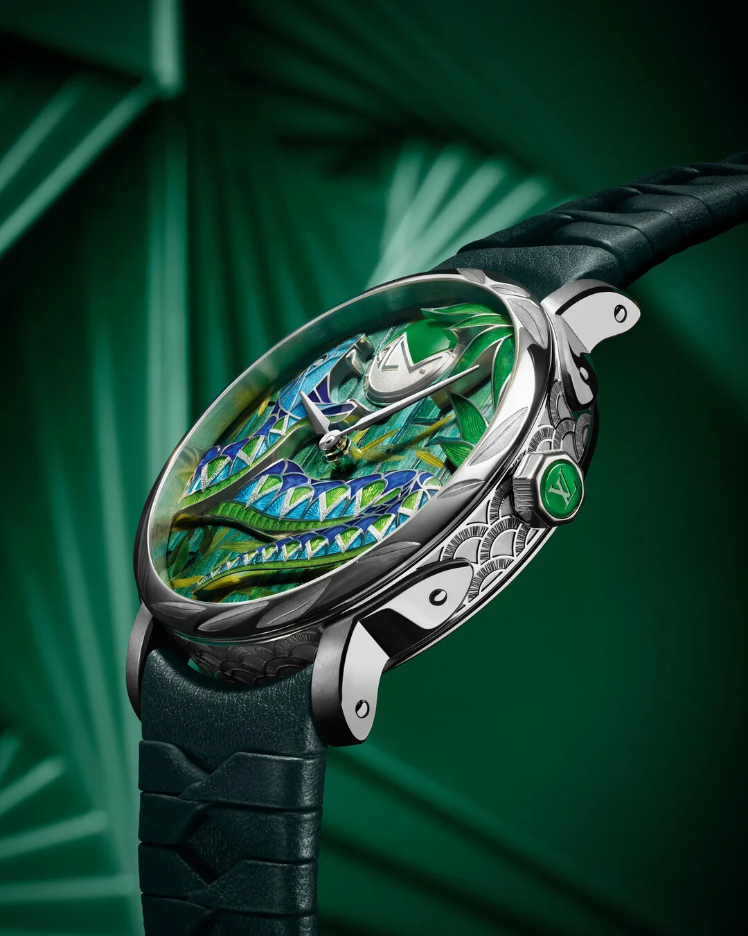 It’s the dial, however, which really catches your attention. In keeping with the Year of the Snake theme we see a colourful serpent slithering its way through the undergrowth. The basis of said undergrowth is a mix of wood, straw and parchment designed to give a sense of depth to the dial. This working technique is called marquetry and is typically found in high-end furniture and cars like Bentleys and Rolls-Royces. Atop that base sit the white gold snake and leaves which are hand-engraved and then given a champlevé enamel coating on top to provide colour. Interestingly, Louis Vuitton provided the names of the artisans doing this work, so, a special mention to Rose Saneuil for the marquetry, Eddy Jacquet for the white gold outlines and engraving, and Vanessa Lecci for the enamel work. All of them brought the snake to life in dramatic fashion.