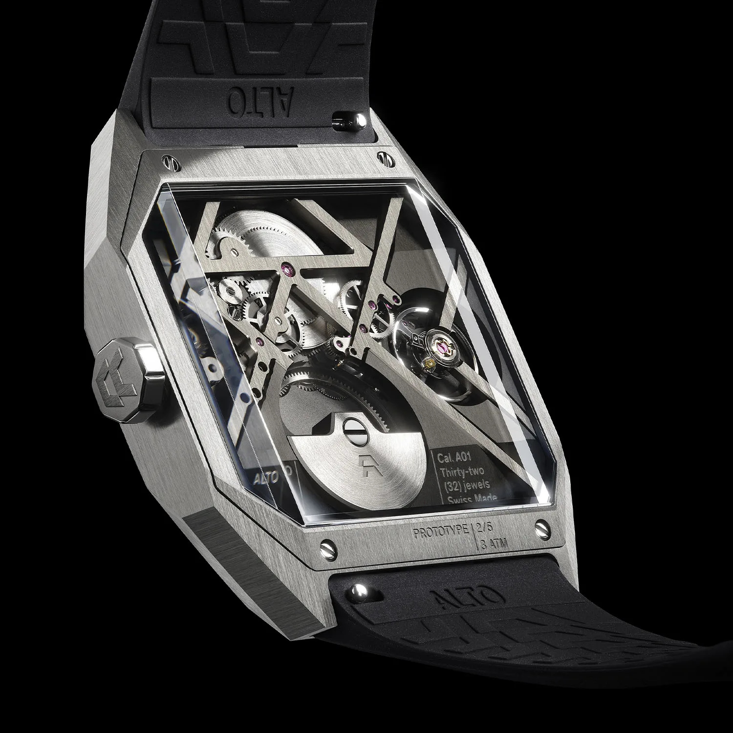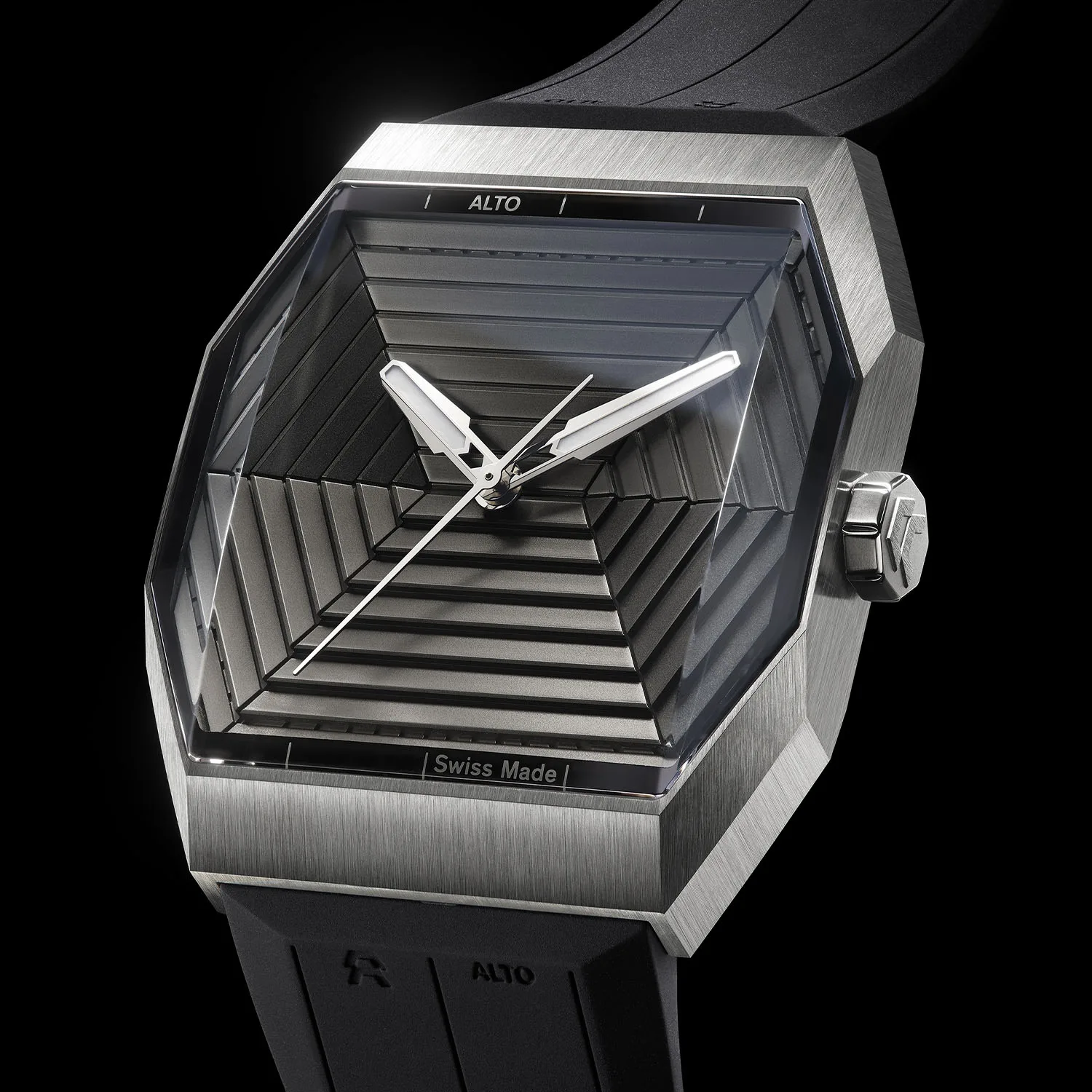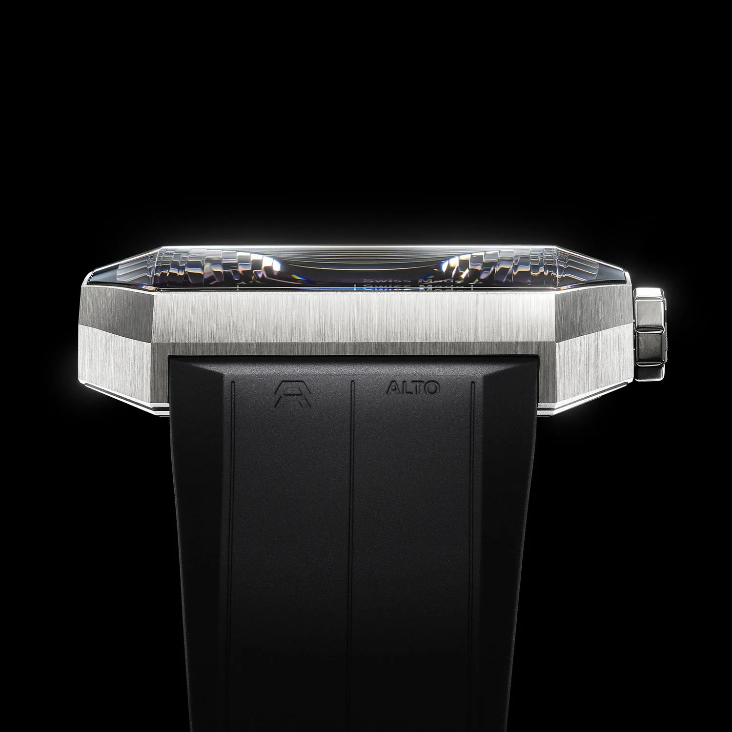 The new ART 01 piece combines 1970s design with modern design and manufacturing techniques. For instance, the sapphire crystal over the dial has two 17-degree angles on the outside but is curved on the inside so as to provide a clearer view; ALTO says it took over 300 hours of work to get this just right. The wedge-shaped case is made of grade 5 titanium and measures around 41mm wide, and all of the brushing and polishing is done entirely by hand.