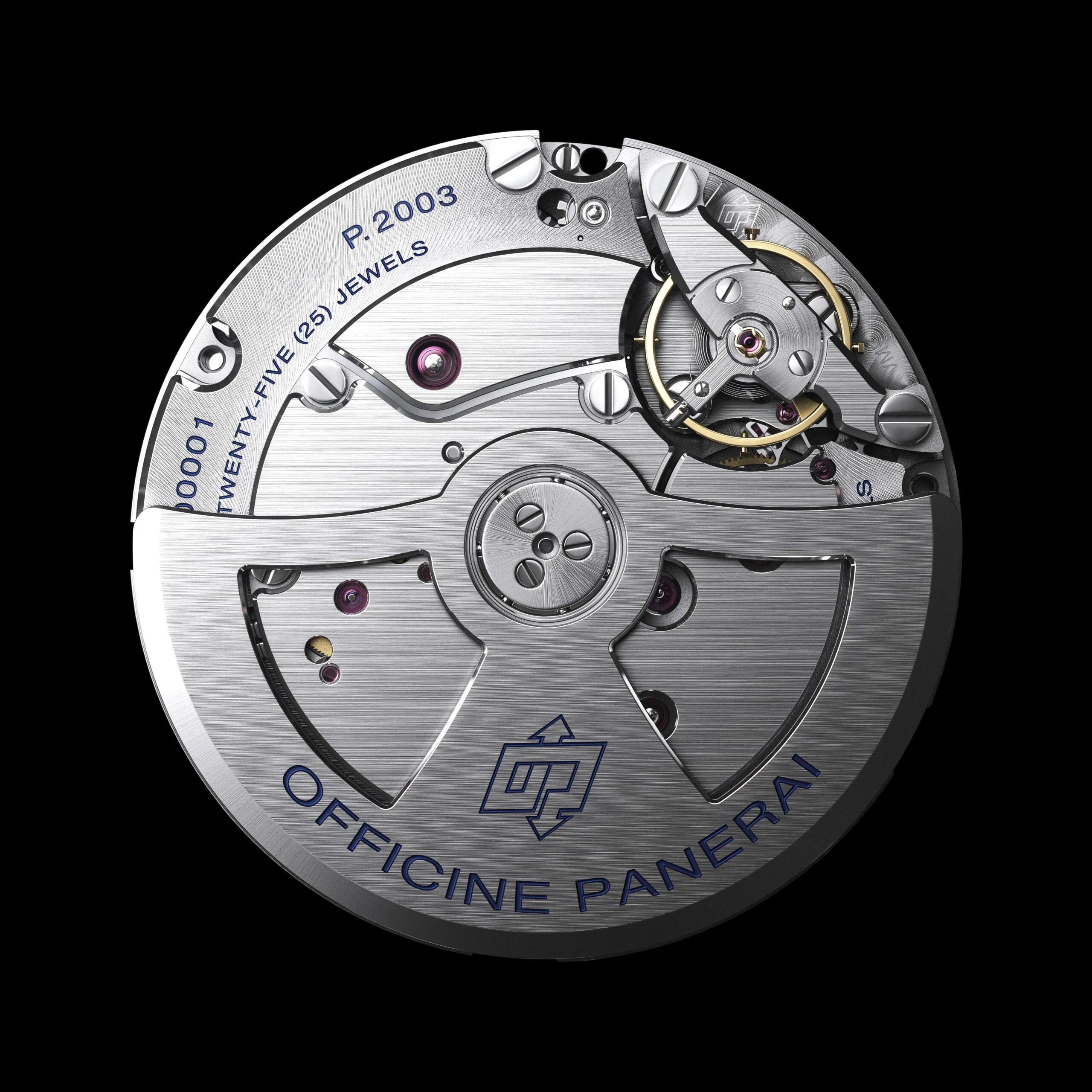The indicator is quite important in this piece as the self-winding calibre P.2003 has an extremely long power reserve of ten days (240 hours). As well as is written on the dial the watch’s name, Dieci Giorni, should be a big clue to this fact. The movement runs at 4Hz and is visible through the sapphire caseback, complete with Panerai’s high-quality brushing and polishing.