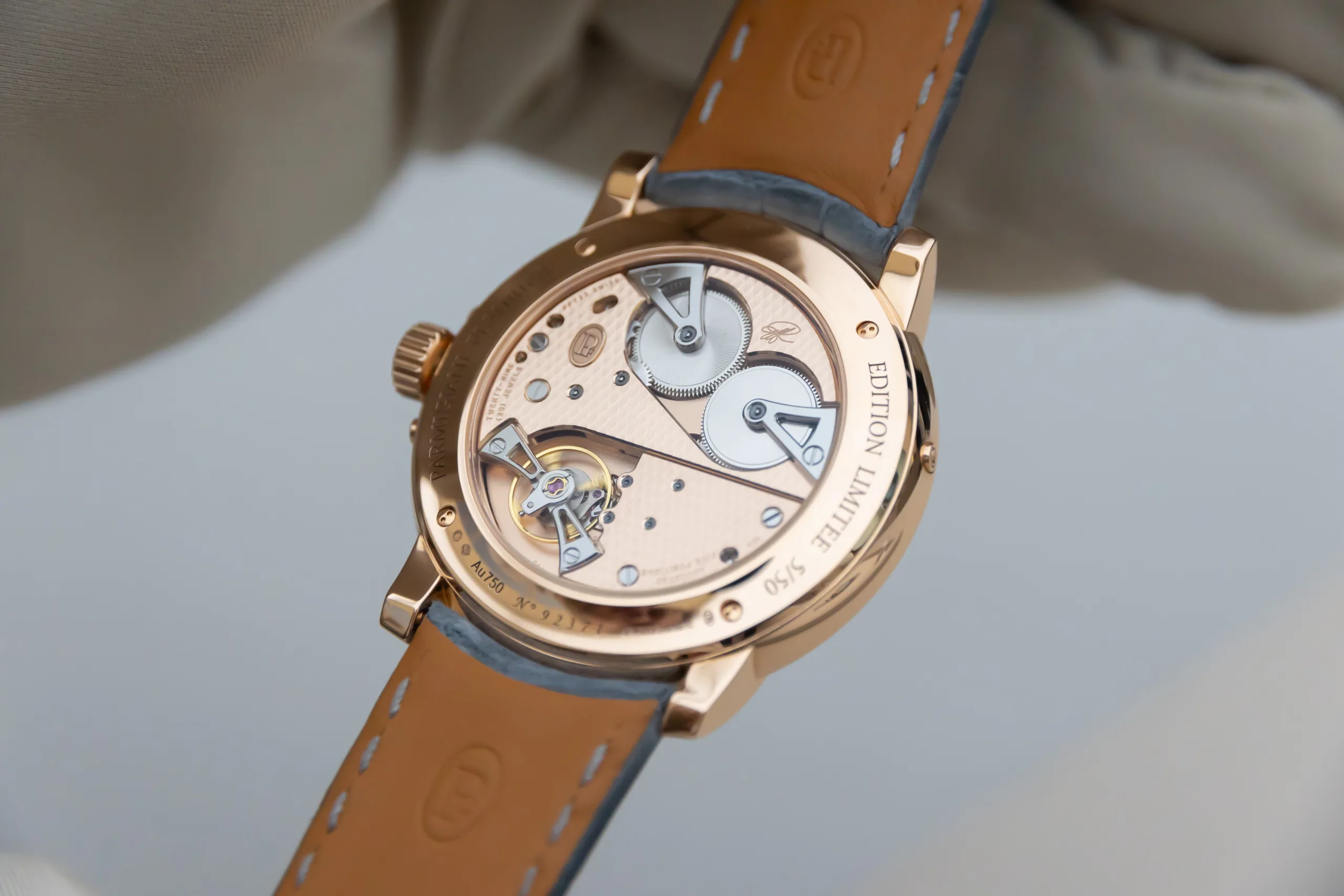 Made of 18k rose gold, this movement offers views of the mainspring barrels and the balance wheel, the rest is obscured behind those gold plates finished with a Côtes de Fleurier design and Michel Parmigiani’s engraved signature. The movements run at 4Hz for 60 hours.