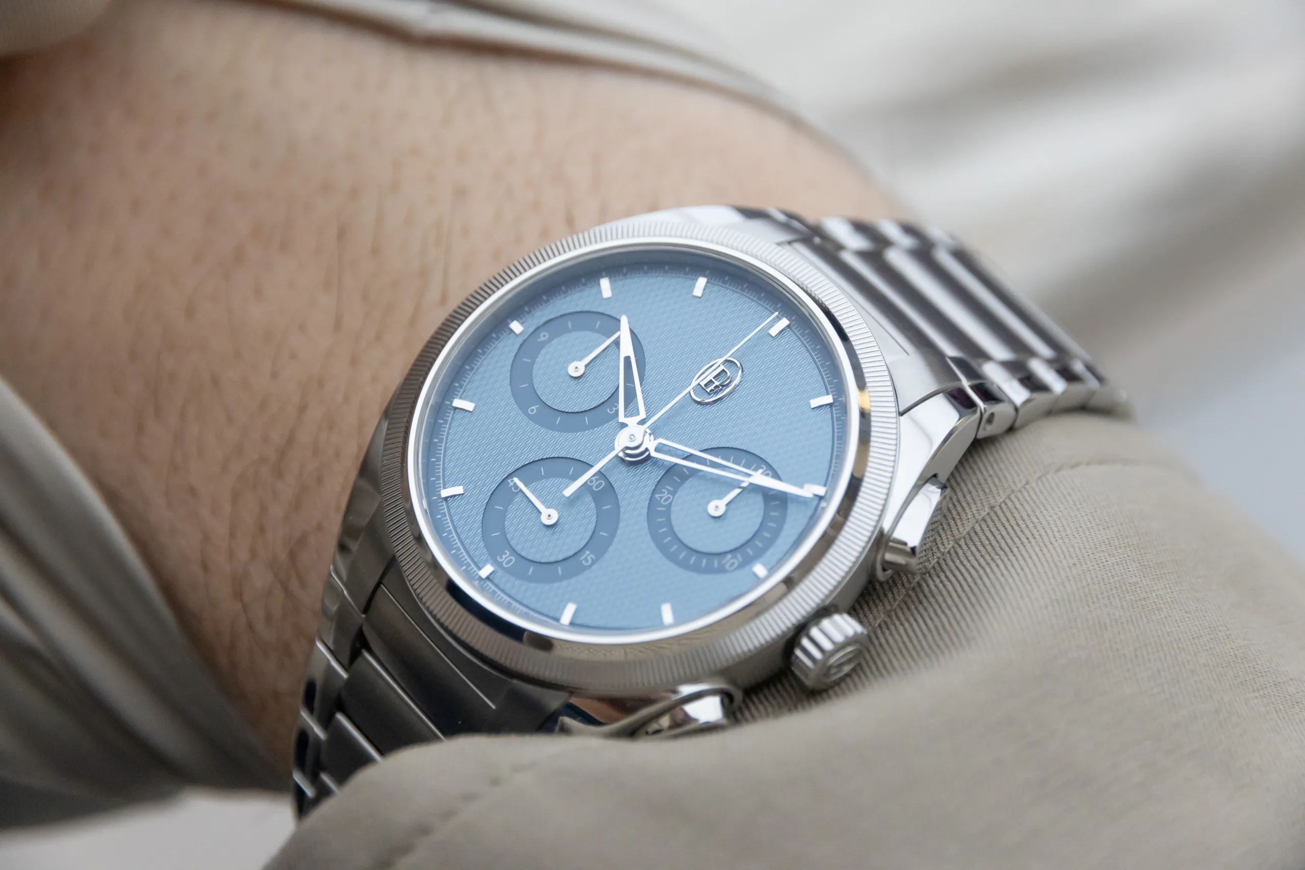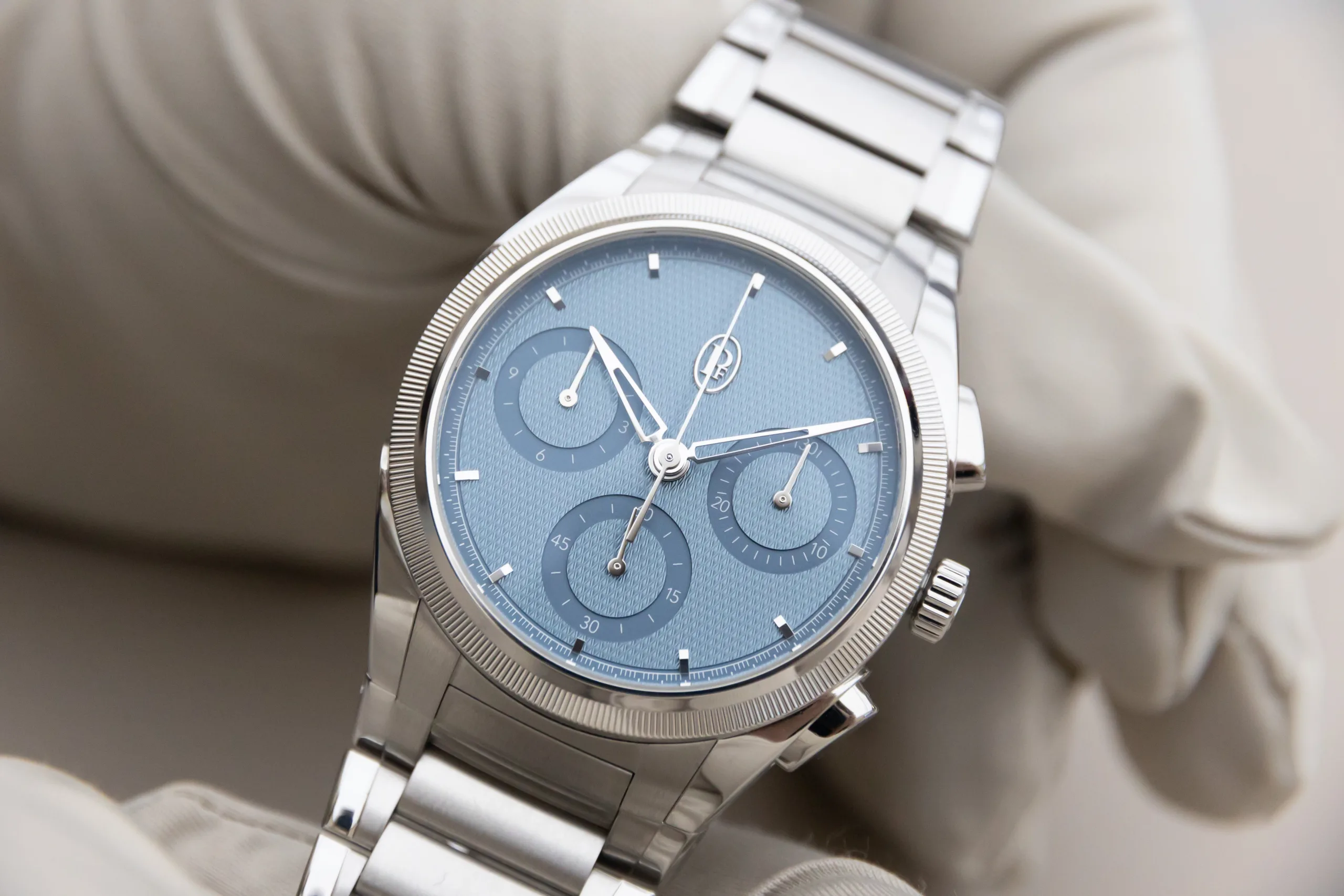 New for 2025 is the Tonda Sport Chronograph, and it comes in two colours, which are ‘Milano Blue’ (as seen here) and ‘London Grey’. The 42.5mm x 13.3mm case is the first ever on a wristwatch to be made of Cermet. Cermet is a mix of ceramic and metal and can be both hard like ceramic and able to resist dents like metal, according to this Wikipedia article I’m reading, anyway. Parmigiani Fleurier says a whole day is needed to put together the 72 parts of the case, which incidentally is made for them by a specialist company in South Korea.