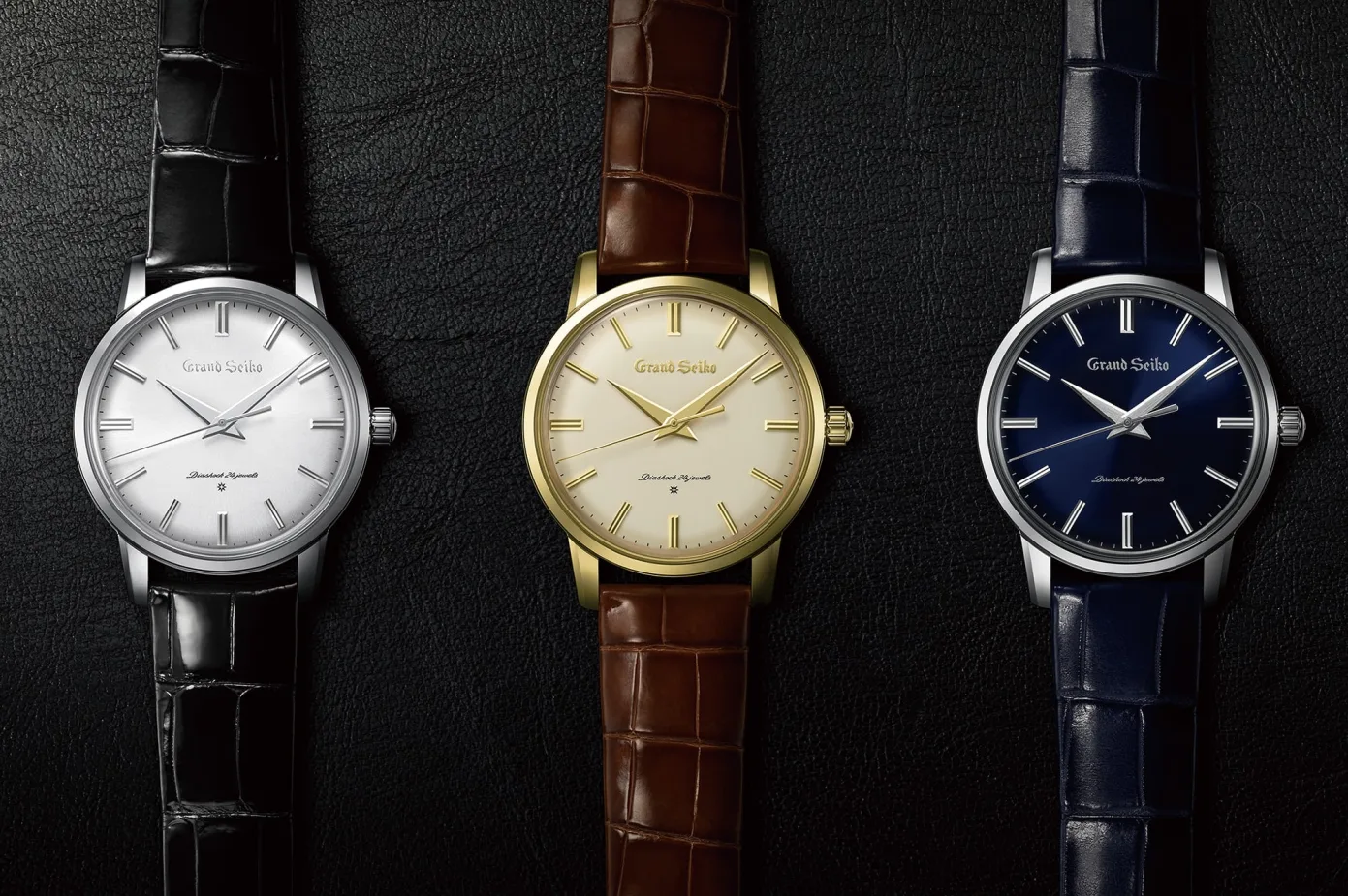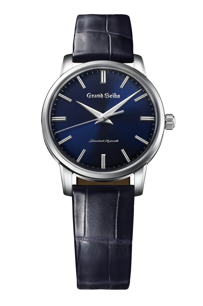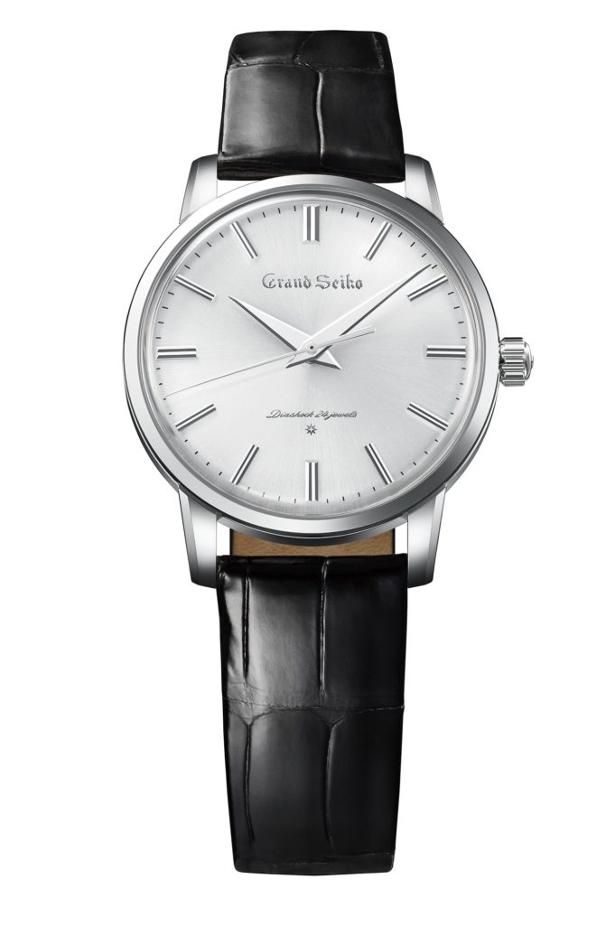 On the dial front, Grand Seiko has chosen elegant looking silver, cream, and blue colorways to complement the platinum, gold and titanium cases. Like the original 1960 reference, the dials have been slightly domed, and the layout has been kept quite clean with a heavy focus on legibility. There are twelve faceted applied markers for hours and a printed track for minutes. The sword-shaped handset is well proportioned and has been slightly bent towards the end to follow the curvature of the dial to ensure that reading time is always a breeze. Even text is kept to a bare minimum with a true to original applied Grand Seiko logo underneath the 12 O’clock marker and the ‘Diashock 24 jewels’ text above 6.