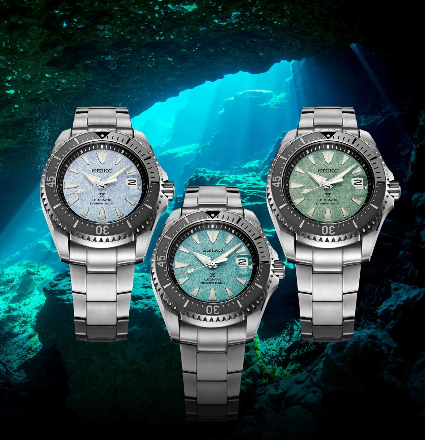 The textured dials on all three models were inspired by caves and other habitats that cave divers encounter underwater, and thus have three variations in colors. The large pointer-type hands are positioned centrally and are in a similar vein as their predecessor and are treated with Seiko’s LumiBrite luminescent material. A date window is found at 3 o’clock which has a cyclops magnification on top of it.