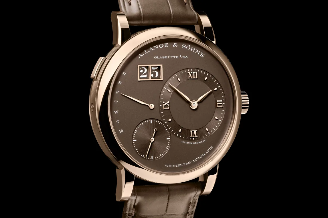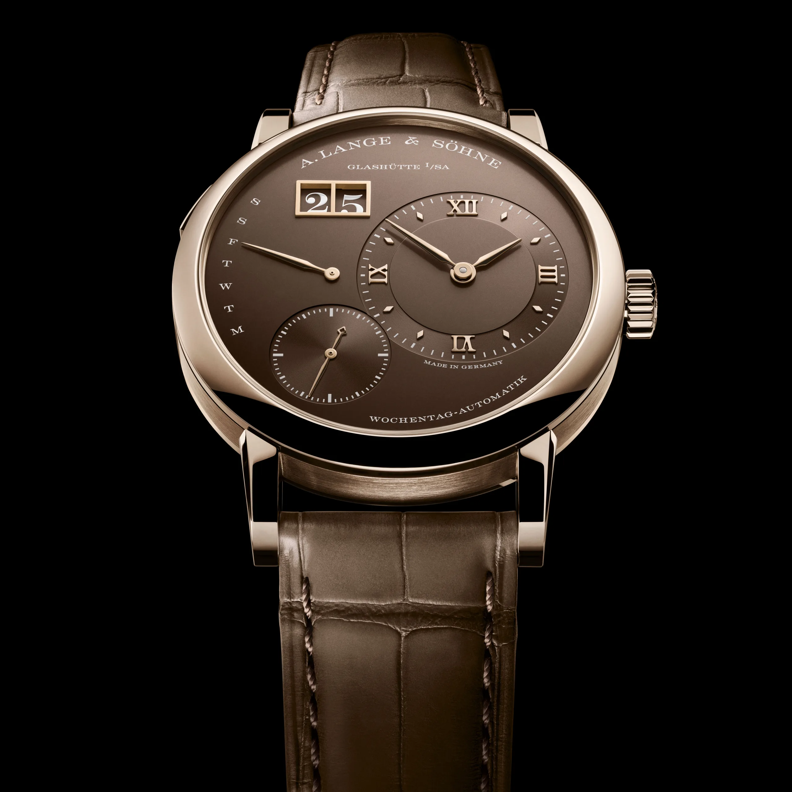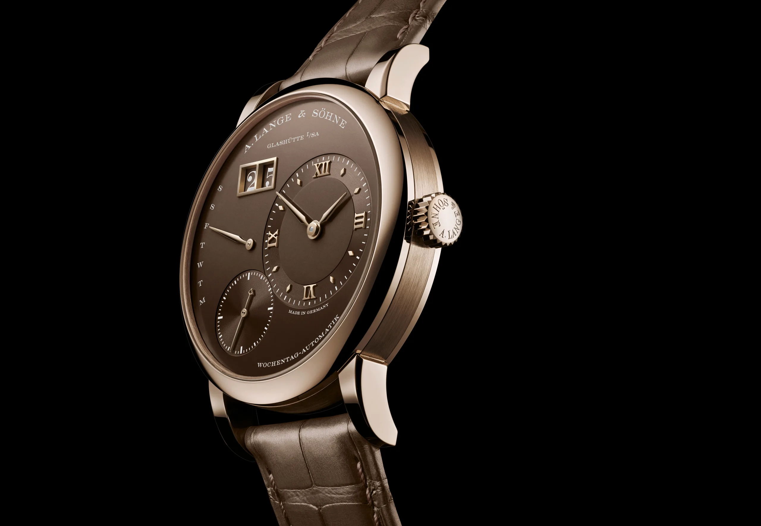 925 silver dial in brown – Lange outsize date – Retrograde day of week display – Subsidiary seconds – Hands in 750 gold