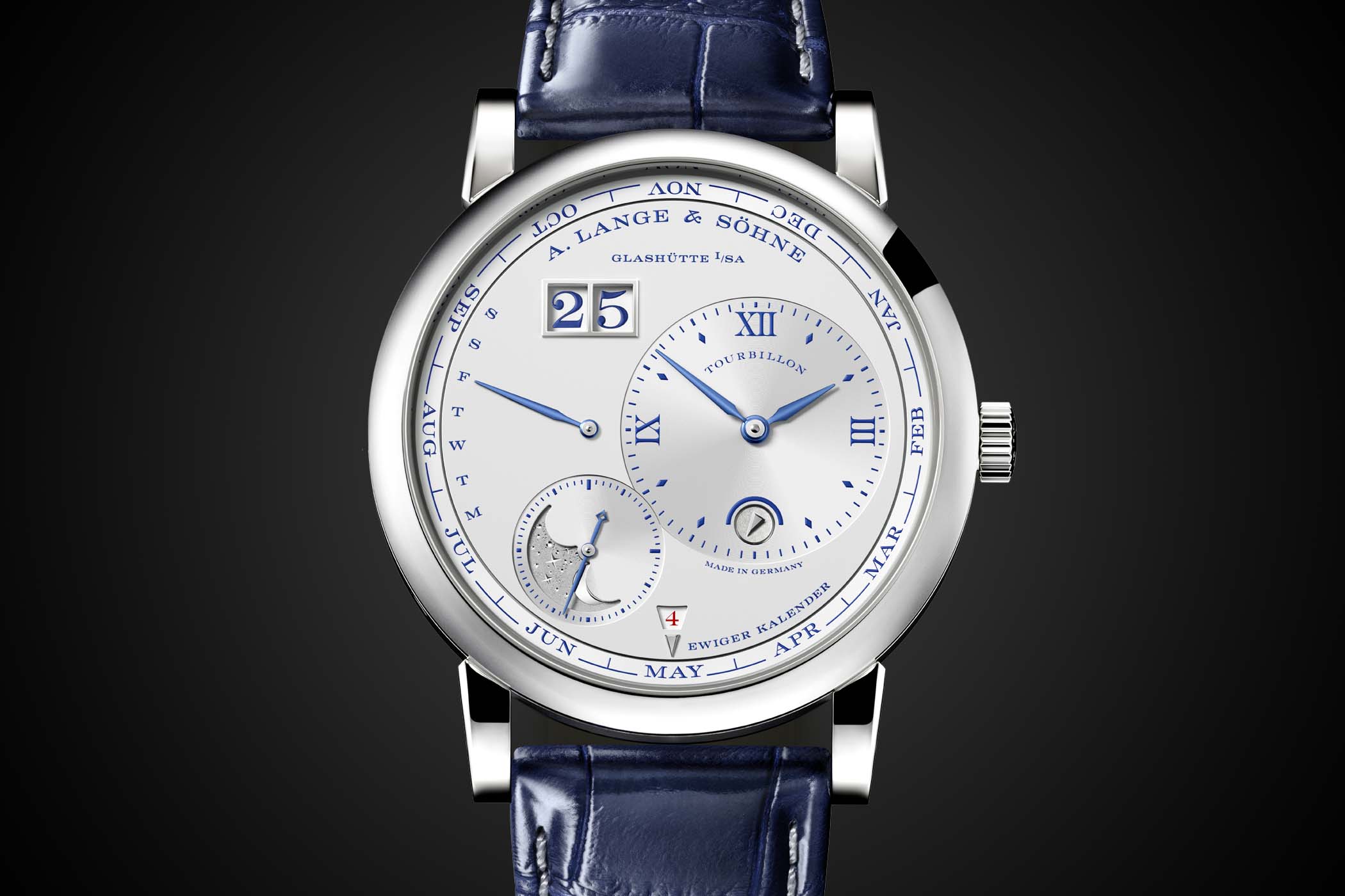 The dial is, like the rest of the 25th Anniversary collection, a solid silver affair with argenté decoration, blue hands and blue markers, the layout has not changed from the non-birthday related Lange 1 Tourbillon Perpetual Calendar. It still has the German words ‘Ewiger Kalender’, which when literally translated means ‘endless calendar’, which is of course what a perpetual calendar is, it never needs interaction unless the watch stops. It’s a beautiful display on this one, quite subtle and easily missed. You won’t miss that silver moonphase, though, it’s impressive, to say the least.