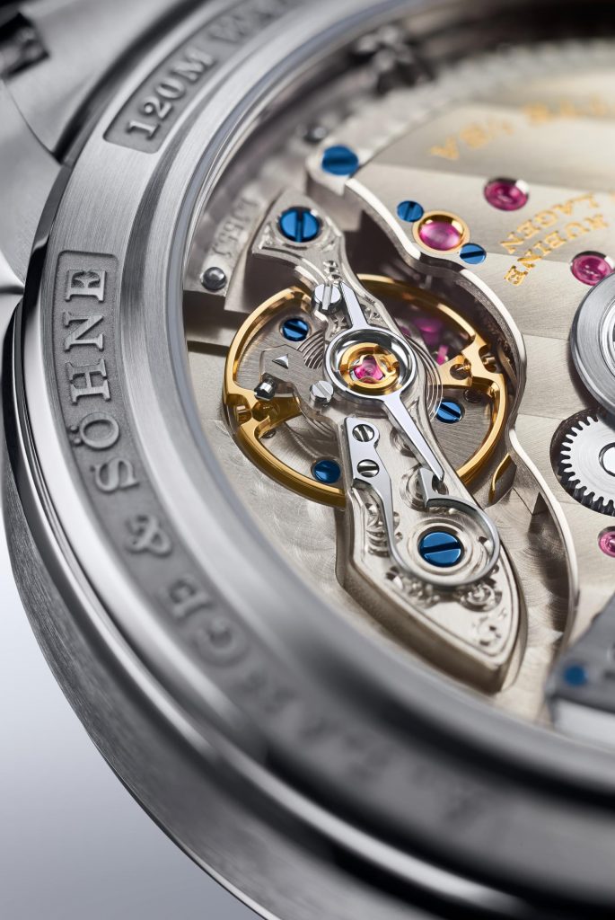 Also of note in the movement department is the new movement’s durability. The fine folks at A. Lange & Söhne may not have made sports watches before, but they understand the necessities that must be included in them. For example, the all-new escapement assembly consists of a free-sprung balance to help absorb severe impacts such as dropping the watch. It’s also suspended from a balance bridge, as opposed to the traditional balance cock that we see in their other timepieces. The balance cock is still made of German silver, and even receives the unique engraving pattern of the individual engraving it, but now offers more security and allows the new balance wheel to operate at the higher-than-normal beat rate of 4Hz. Most of their other offerings are half this, so the new watch should be even more accurate. I also remembered to quiz them about magnetism and whether there was any particular resilience to it for this ‘everyday Lange’ and the reply was that this watch is as resilient to magnetism as their other watches, whatever that is.