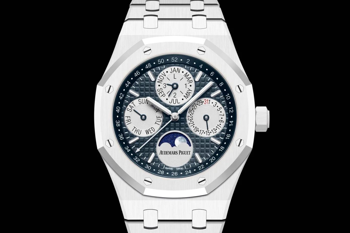 Akin to the case, the dial also exhibits the Royal Oak DNA through the distinctive and beautiful Tapisserie pattern which has been rendered in a subdued shade of blue. Characterizing the dial are four silver sub-registers which display the perpetual calendar functions and provide a nice contrast against the blue backdrop. This implementation of the calendar complication is commendable as it keeps the symmetry of the dial intact and helps improve overall legibility.
