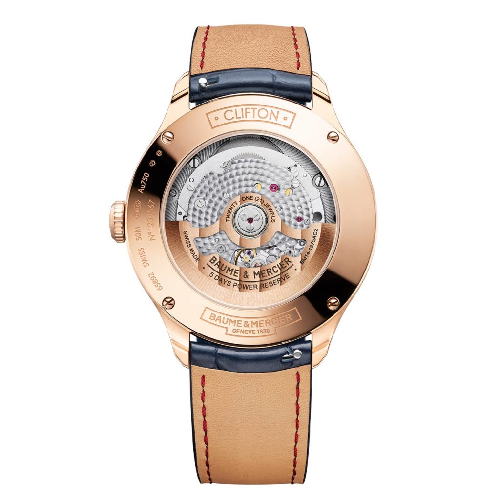 Thec case on the Clifton Baumatic Day-Date Moonphase is crafted from solid pink gold and has a slightly larger footprint than its younger 3-hand cousin measuring 42mm in diameter with a thickness of around 13mm. A sapphire crystal on the front protects the dial and there is also an exhibition window on the back giving a nice view of the well-decorated Baumatic BM14 calibre. An in-house automatic movement, the BM14 operates at a frequency of 4Hz and offers a massive power reserve of 120 hours. The modern movement is COSC certified to offer extreme accuracy and features a silicon escapement to provide better magnetic resistance.