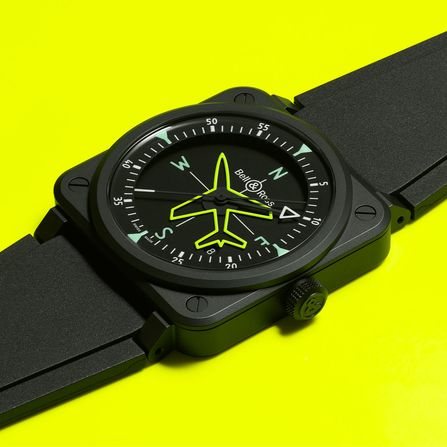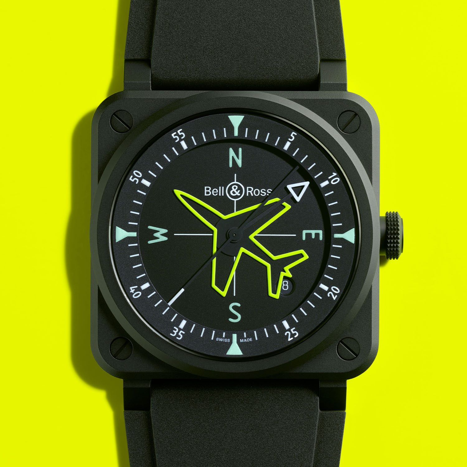 Bell & Ross’ newest ‘Instrument’ watch, the BR 03 Gyrocompass, definitely implements aviation into a practical, wearable experience. In flight, the gyromagnetic compass, or gyrocompass, is equipped and used to indicate true north, it’s one of many, many pieces of equipment used by pilots to safely navigate in day or night conditions. Bell & Ross adapted this with ease for their first Gyrocompass model ten years ago, so it’s good to see they’ve still got it. The yellow jet-fighter-shaped hand shows the hours, while a triangle-tipped hand shows the minutes and a thin stick hand the seconds. There’s also a date window which I don’t think this needed, but it’s there.
