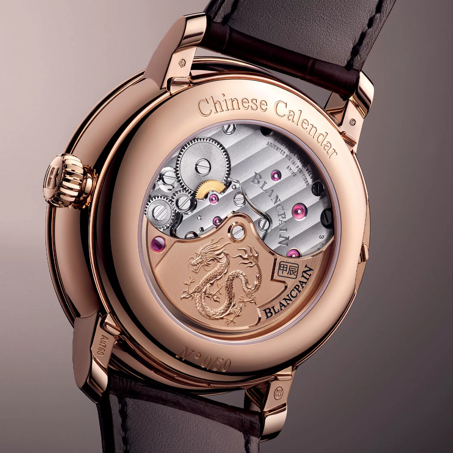 Interestingly it was 12 years ago, the last year of the dragon, that Blancpain unveiled their unique Villeret Calendrier Chinois Traditionnel (Traditional Chinese Calendar). This watch is most distinguished from its Blancpain brethren by its huge size, at least when looking at it through a window. At 45.2mm x 15.1mm it’s a damn sight bigger than nearly every other Villeret that Blancpain makes. But, it’s when you take a closer look that you see the real reason for its size is it’s got two calendars running within it. The self-winding calibre 3638 is 32mm across, has 464 components within, a 4Hz beat rate, a 7-day power reserve (168 hours) and gorgeous finishing. All of the functions except the time are adjusted by the patented adjusters which are on the caseback and under each lug.