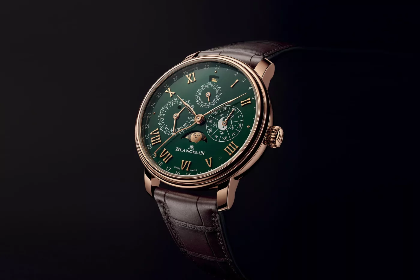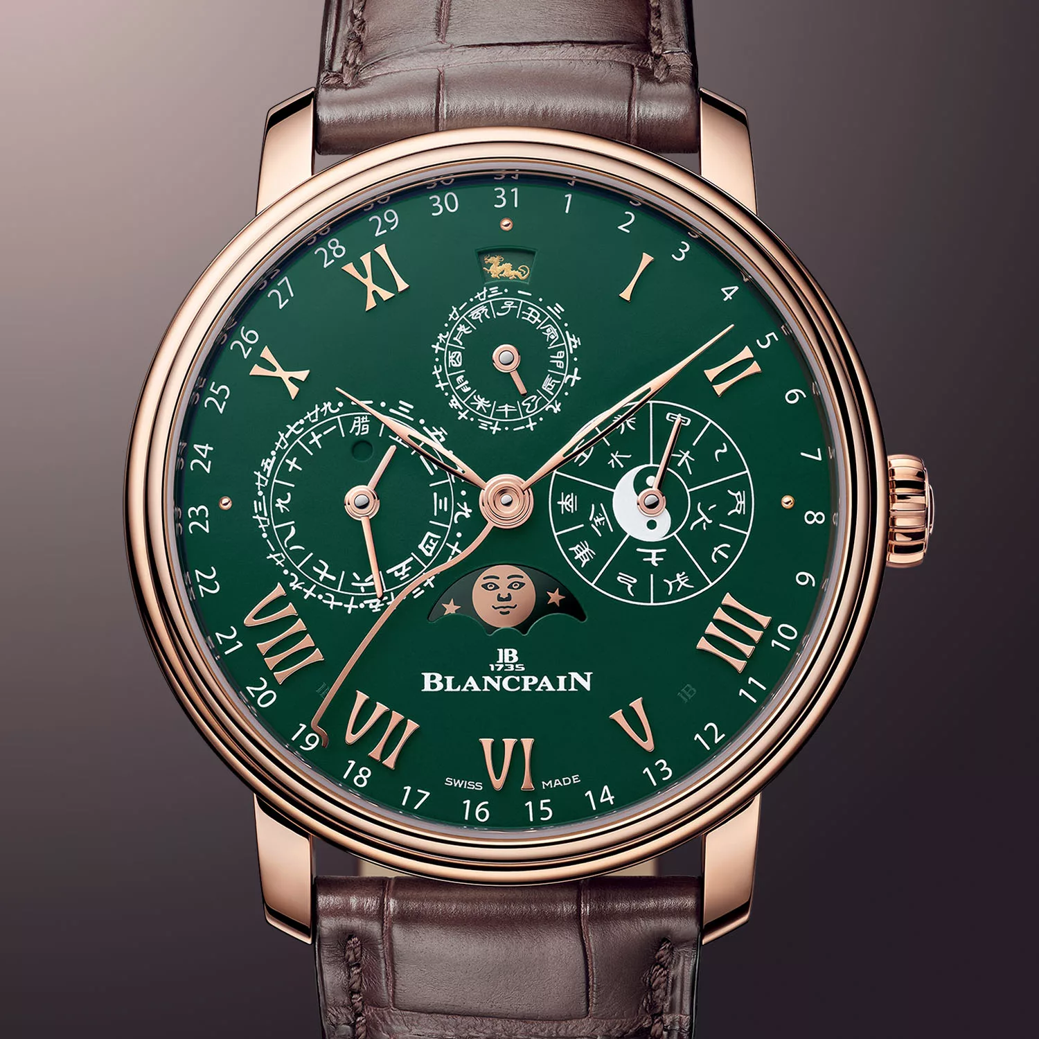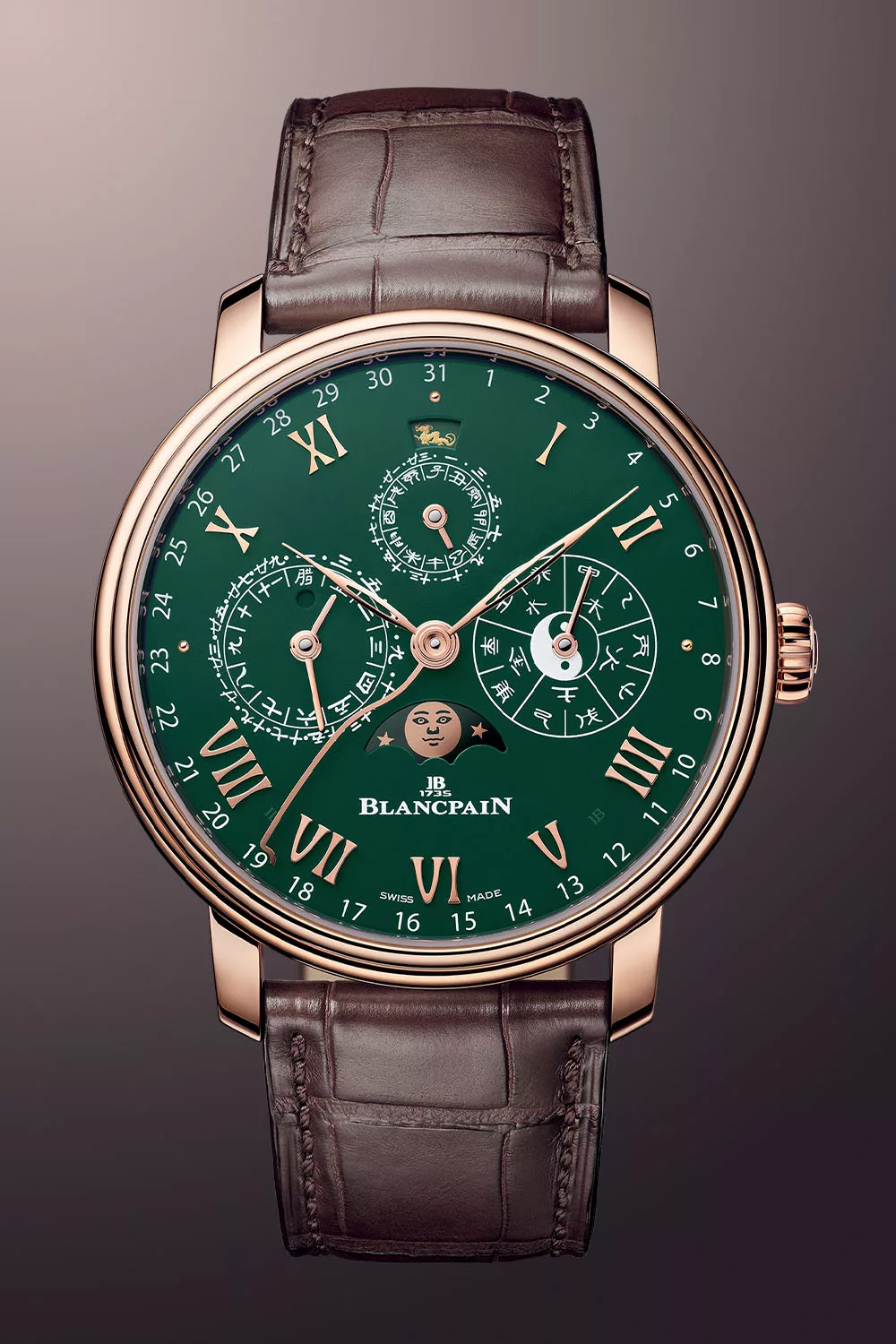 Finally, as if all that wasn’t enough, the watch indicates the year’s zodiac sign via a small cutout. All of this is presented on the enamel grand feu dial which is painted green, it complements the 18k red gold case very well and is matched with a green alligator leather strap.