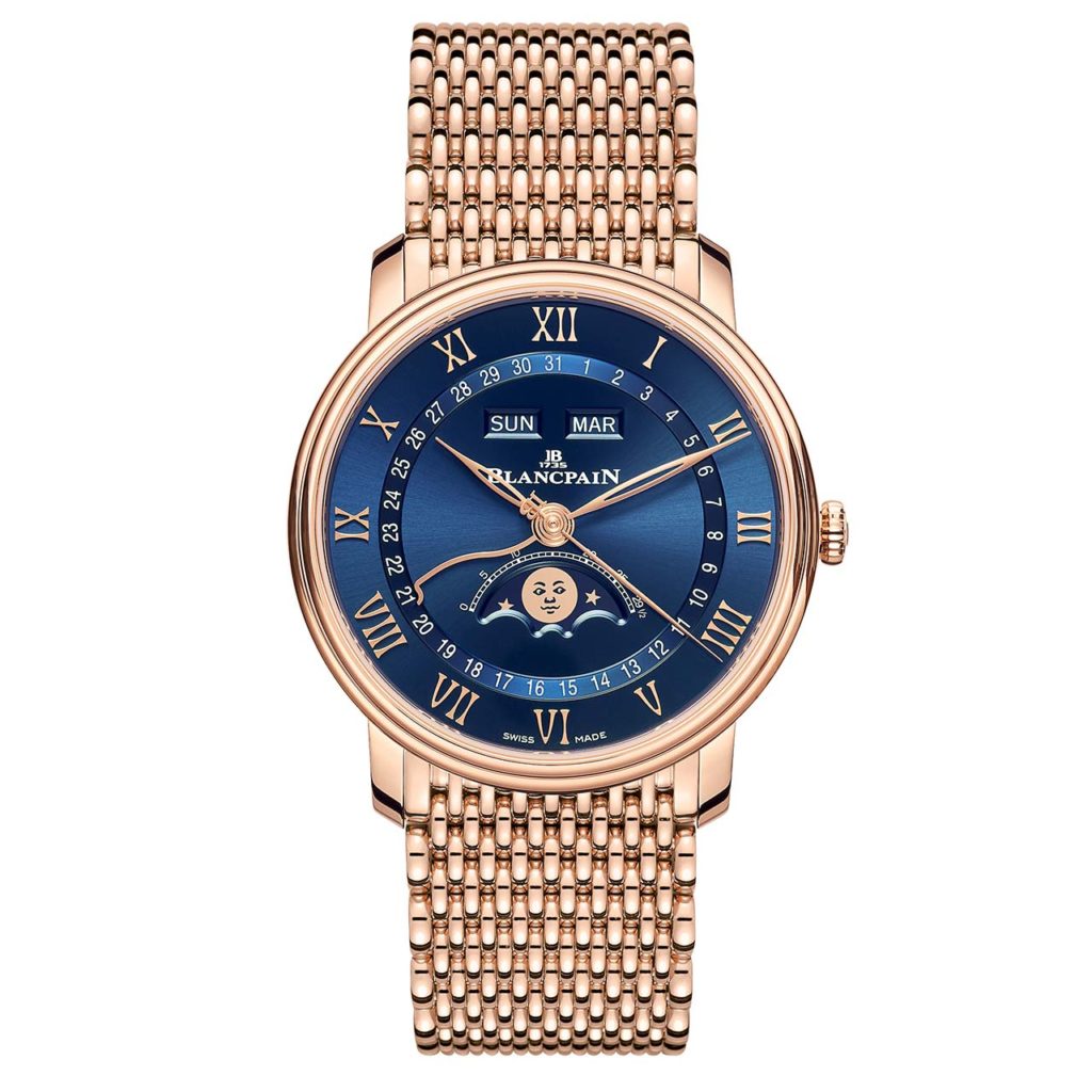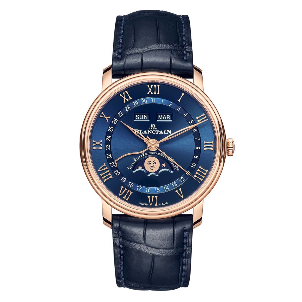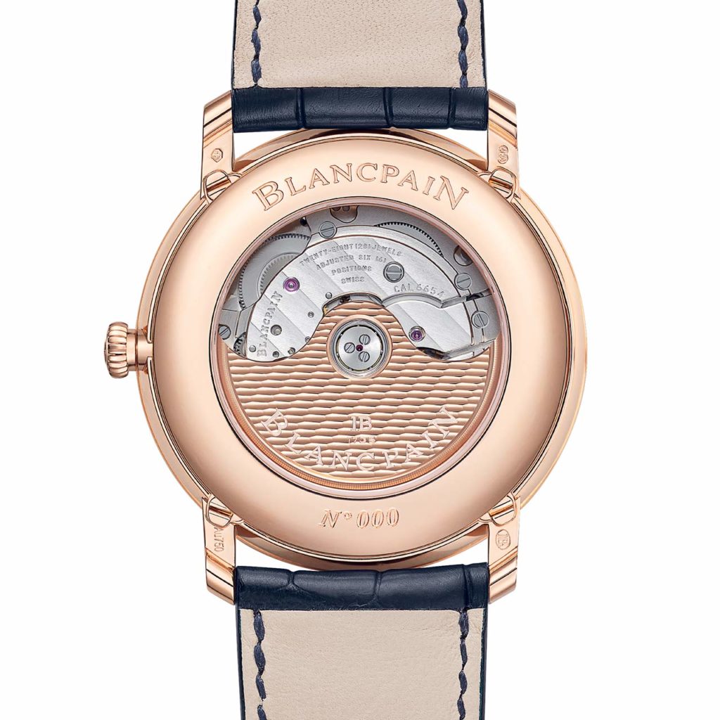 Inside the smart 40mm red gold case is the calibre 6654 which is used by the brand in every complete calendar variant (bar the complete calendar GMT) of the Villeret, and even finds its way into the Fifty Fathoms Bathyscaphe too. It has 321 components, 35 jewels and a power reserve of 72 hours. It’s also got a smart-looking rotor engraving which we like very much.