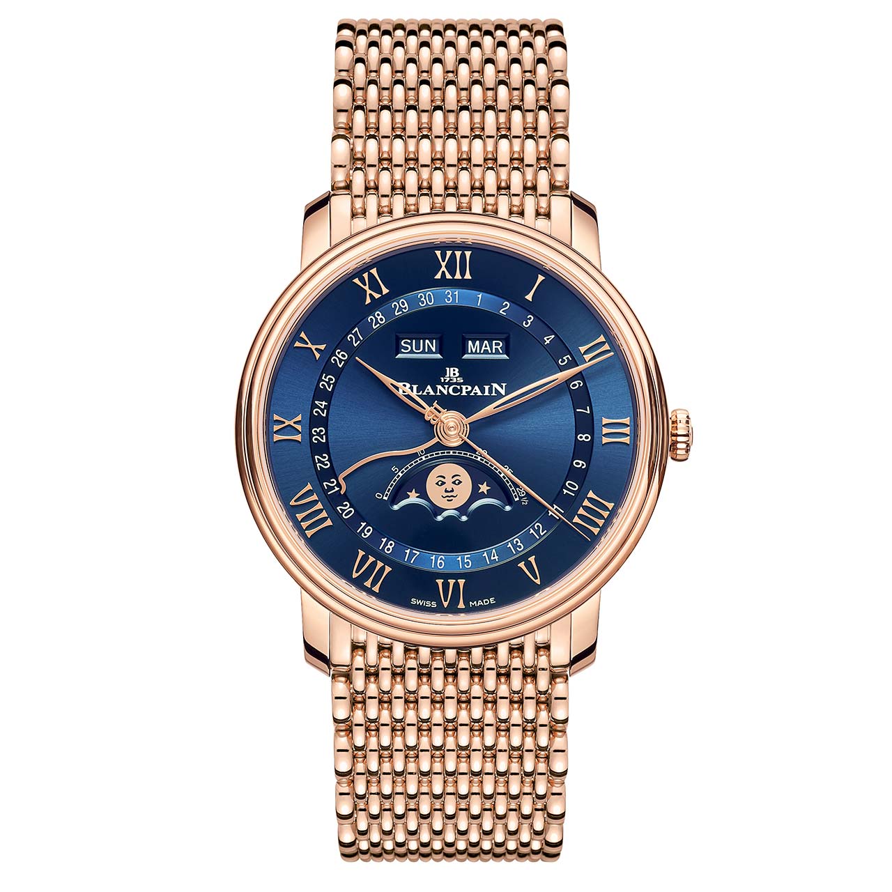 The red gold case of this watch paired with the deep blue dial and strap of the Blancpain makes for a compelling case indeed. It’s finished off by the characteristic face on the moonphase disk which makes this watch sparkle just that little bit more. The price of this watch on the leather strap is CHF 24,000, but there is also a “mille mailles” bracelet which is made of strands of gold that appear to have been woven together, the watch with that option will cost considerably more at CHF 42,000.