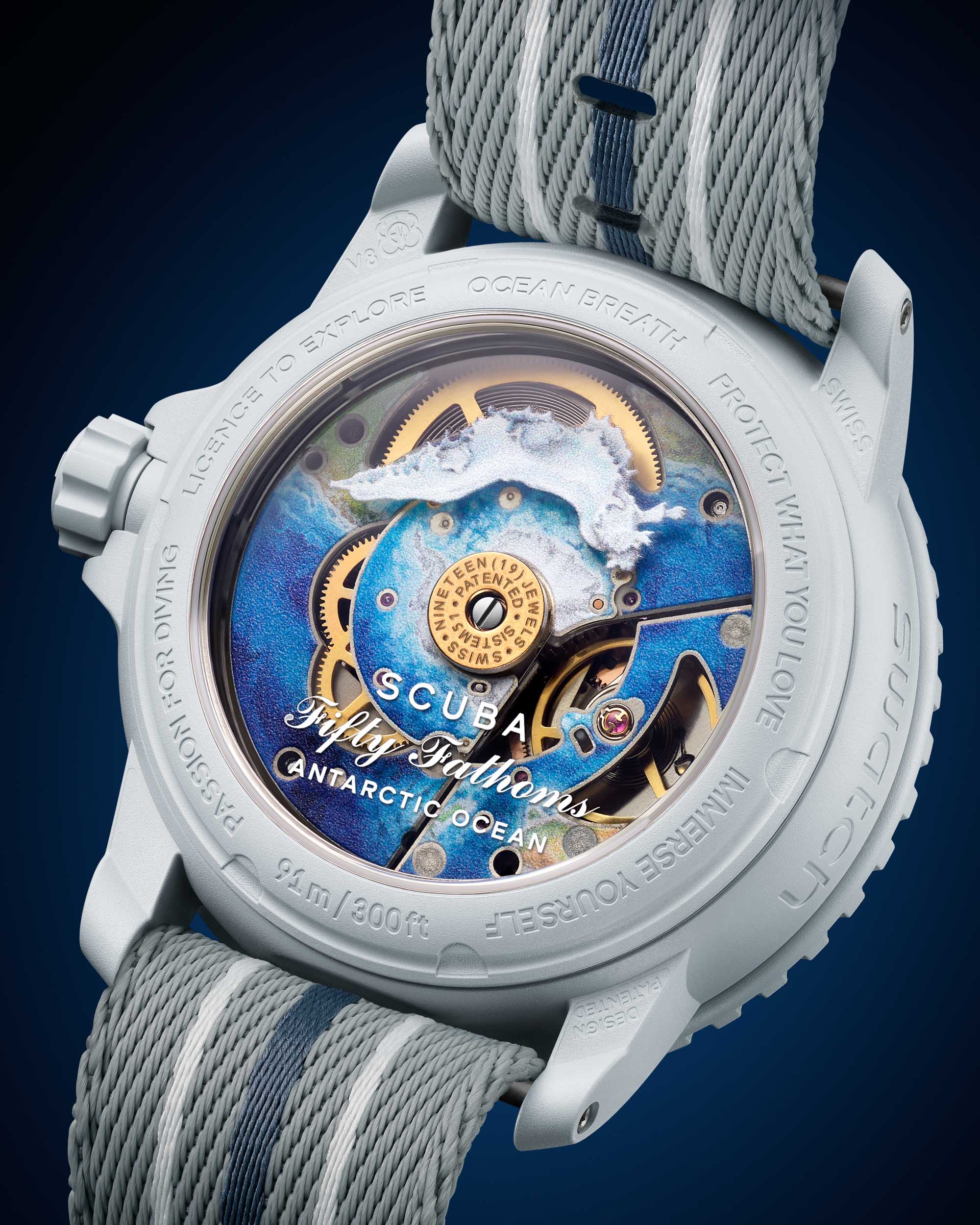 There are five different versions going on sale, all with Swatch’s Bioceramic case technology, and the five models represent the five main oceans of our planet. The Atlantic Ocean model has a blue case and gradient dial with a matching NATO strap. The Pacific Ocean watch features a yellow case with yellow detailing on the strap and a white gradient dial. The Indian Ocean version features a green case with matching strap and dial details.