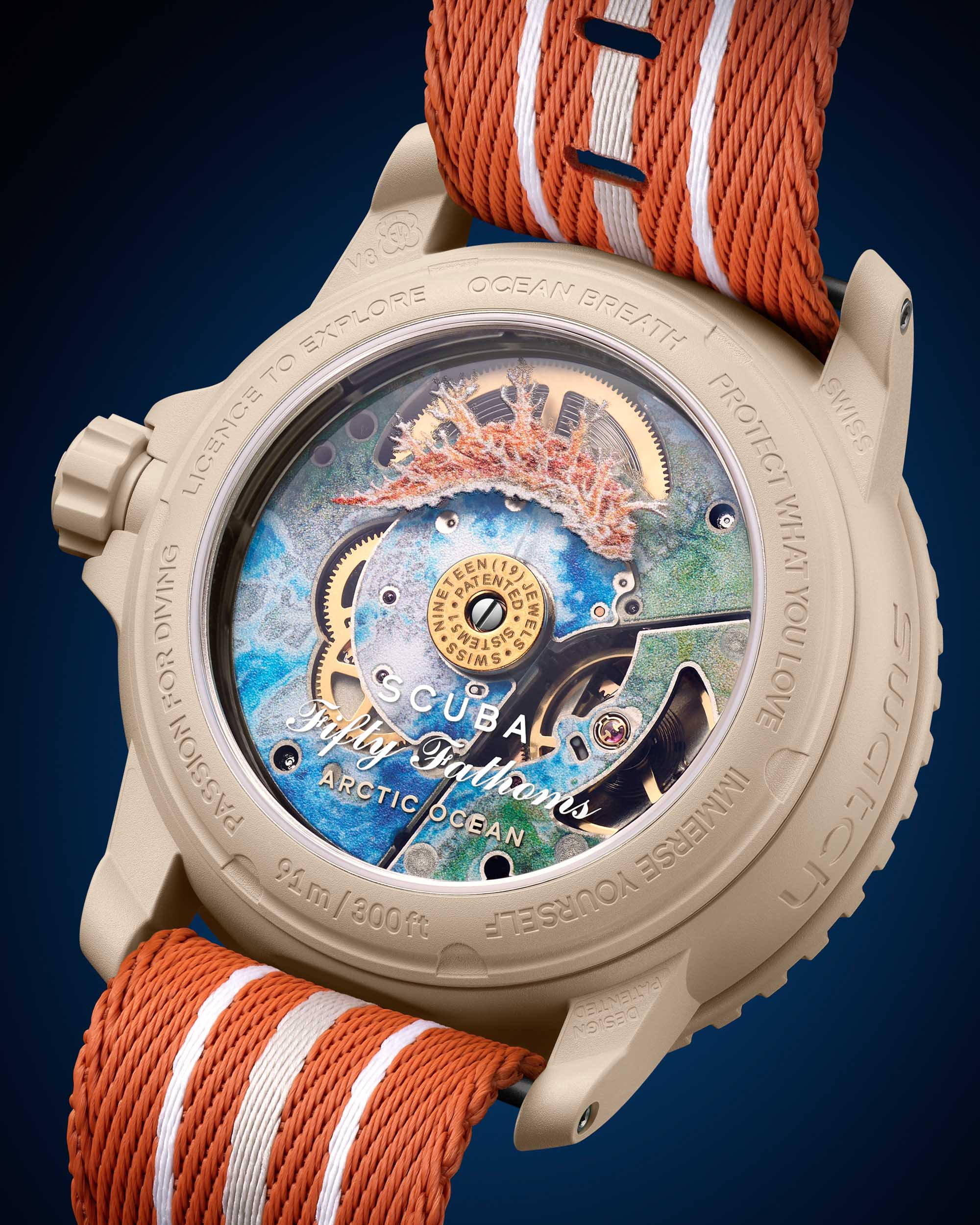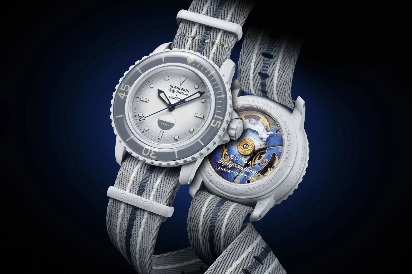Then there are the versions for the Arctic and Antarctic oceans, and they’re a bit more unique. The Arctic Ocean version has a beige-y orange case with orange detailing and an orange strap. It also displays the No-Rad symbol which Blancpain originally used to signify its watches didn’t use radioactive lume. The Antarctic version has a white case with grey and blue detailing and features the Mil-Spec symbol, which also doubles as a moisture detector. I’m surprised Blancpain allowed this, the Mil-Spec and No-Rad models are very special to them.