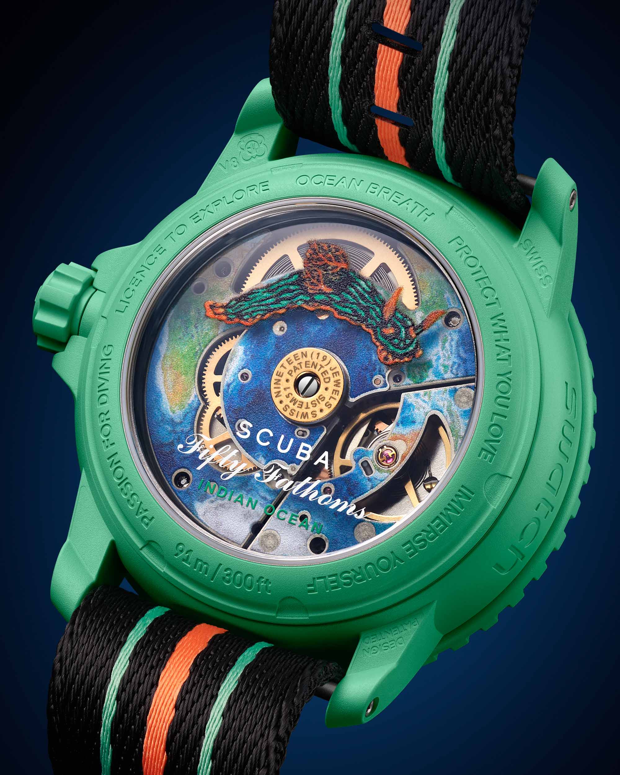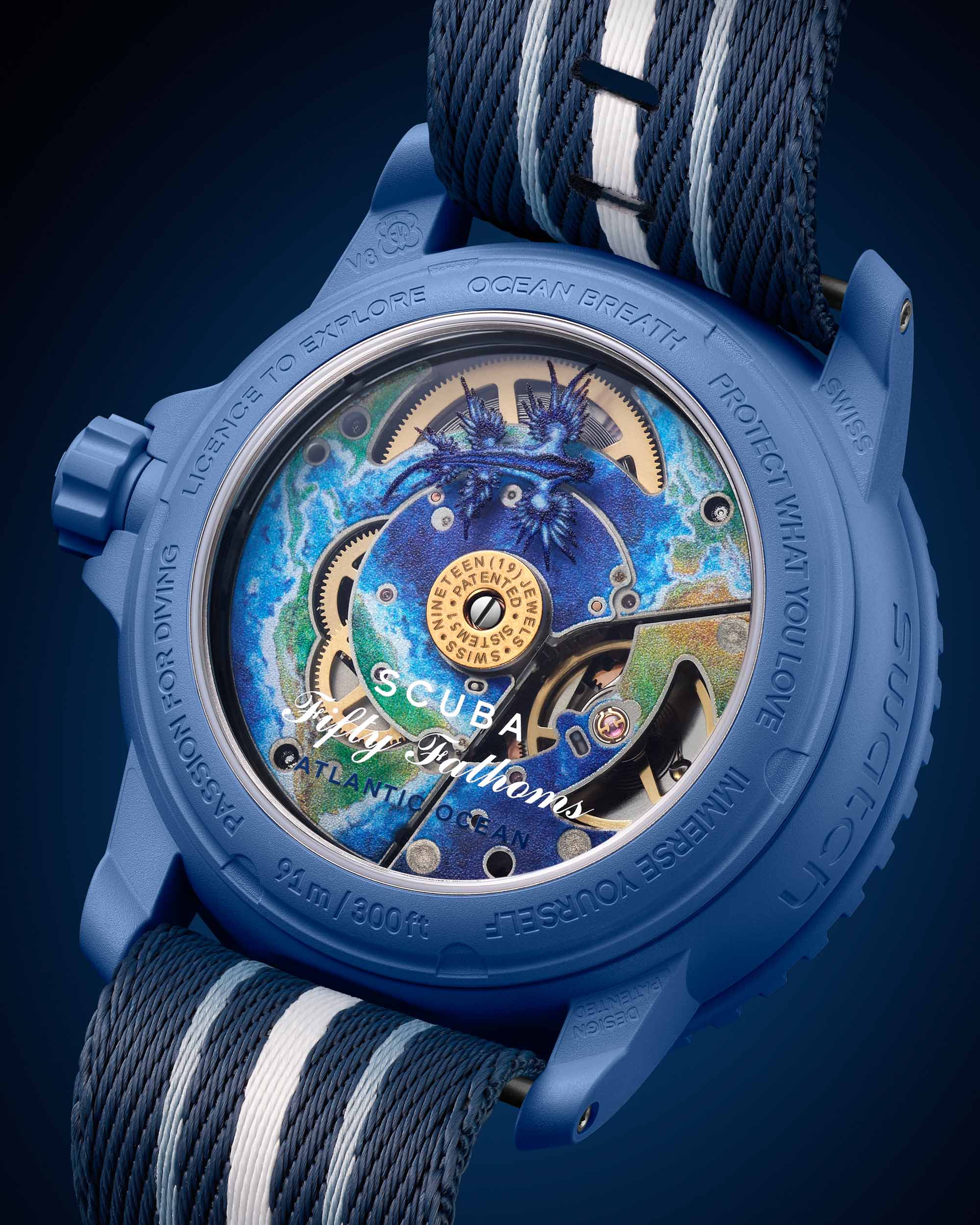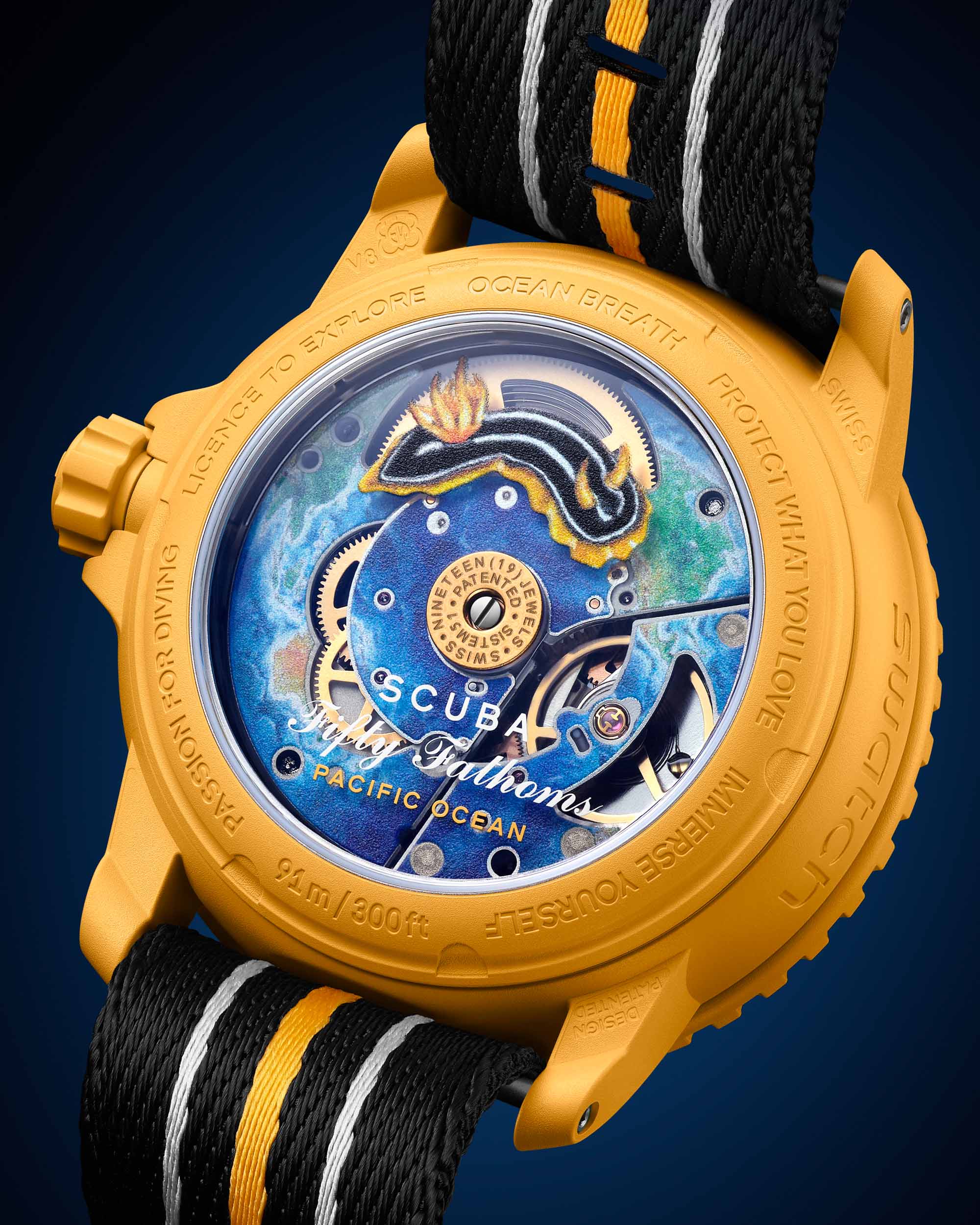 Inside the watches is a mechanical movement. Despite Swatch’s penchant for making fun and replaceable quartz-powered watches (this was what made them so popular), the Blancpain X Swatch watches use the Sistem51 movement, which is Swatch’s revolutionary mechanical movement for mass production. It features just 51 components, and yet it has automatic winding, a 3Hz beat rate and a 90-hour power reserve which I believe is longer than Blancpain’s Fifty Fathoms watches have. The rotor of the movement features a representation of a Nudibranch, one of the ocean’s more exotic creatures, and the movement plates have oceanic decorations printed on them.