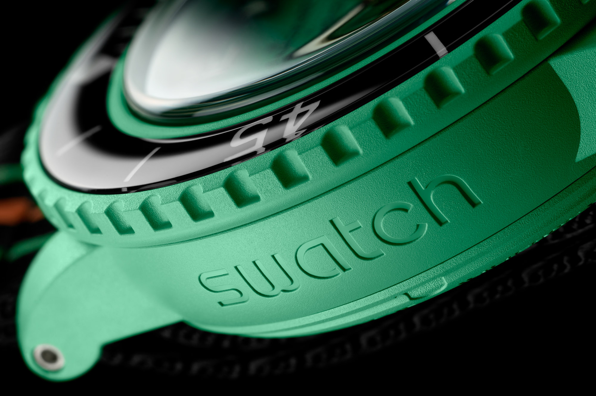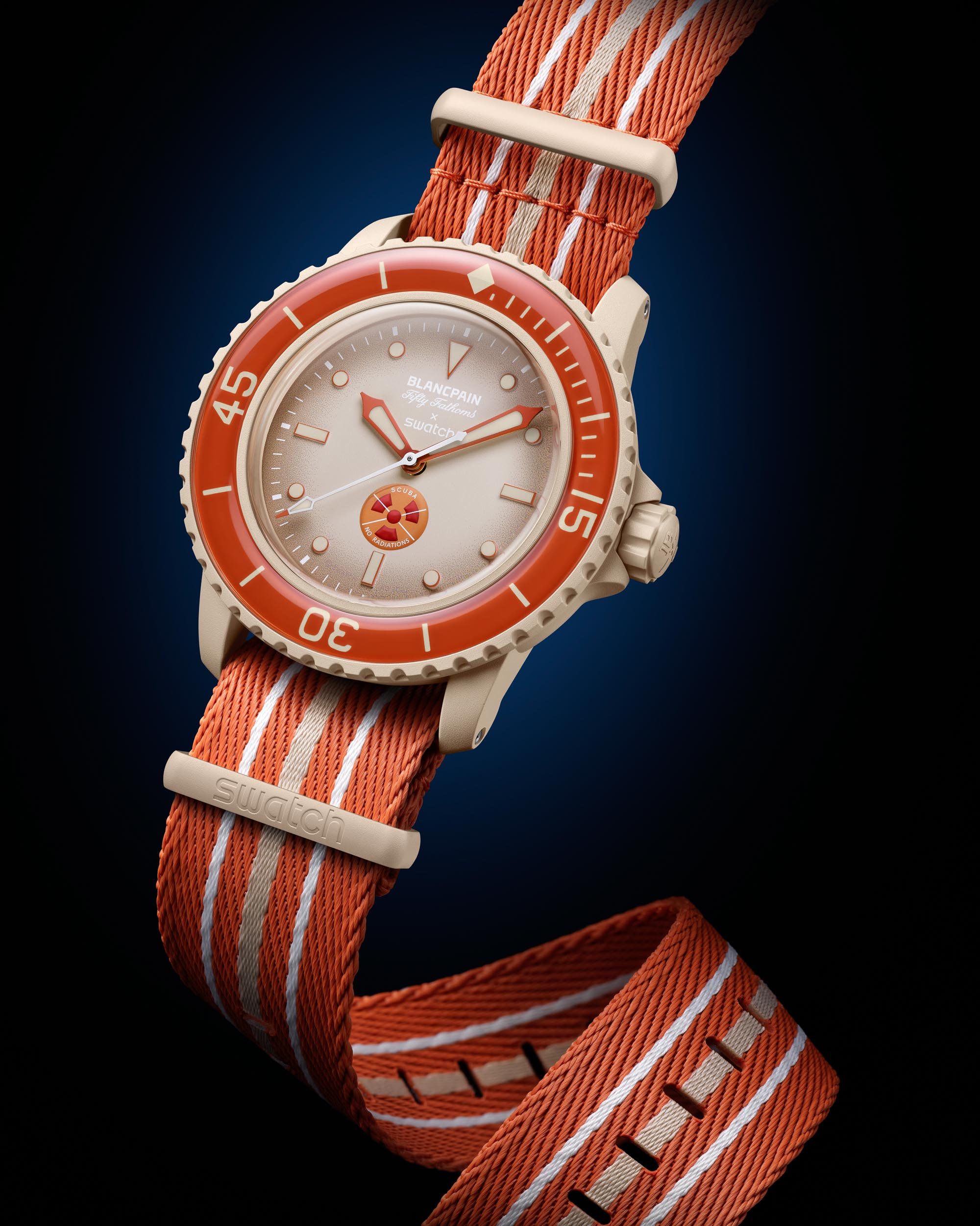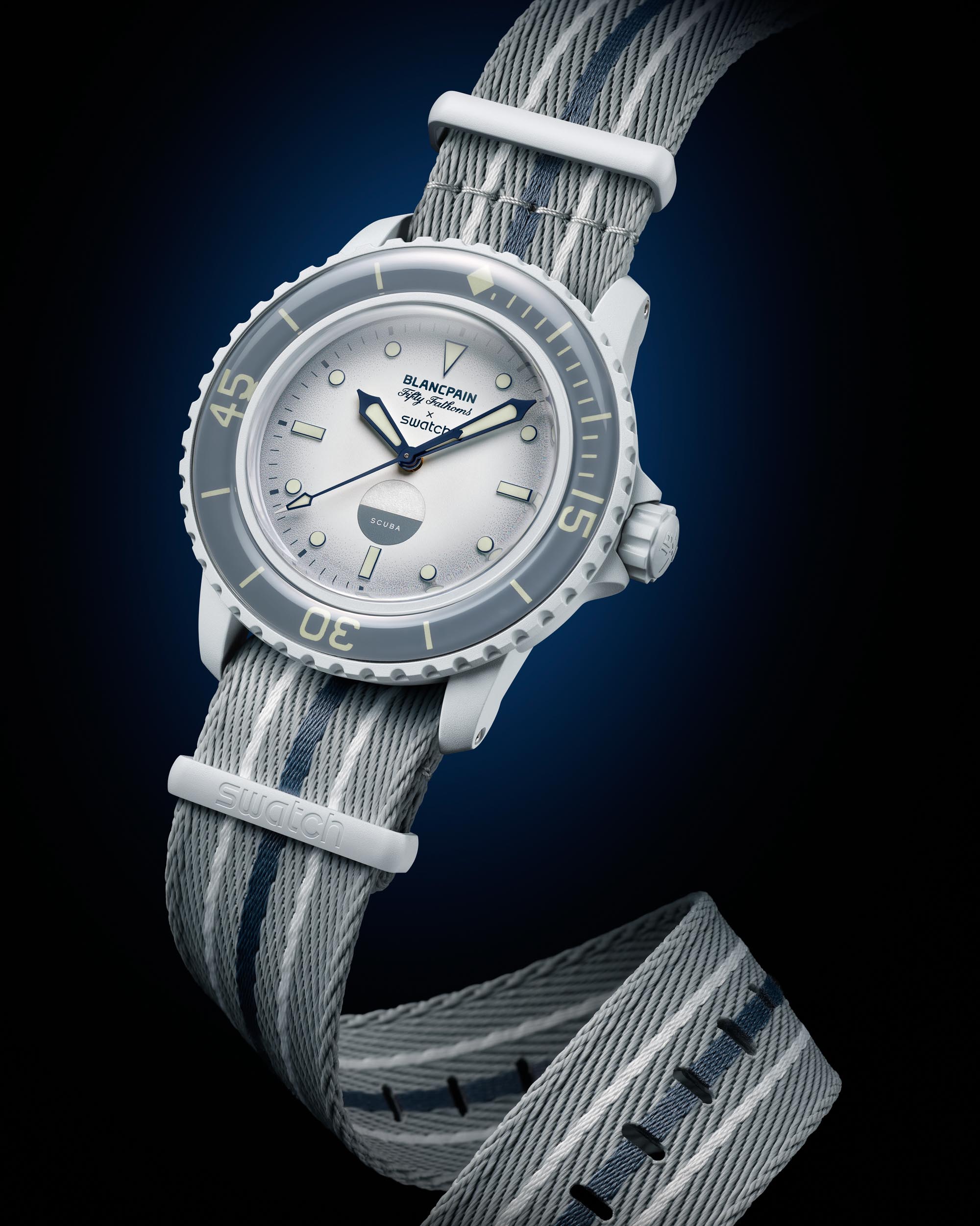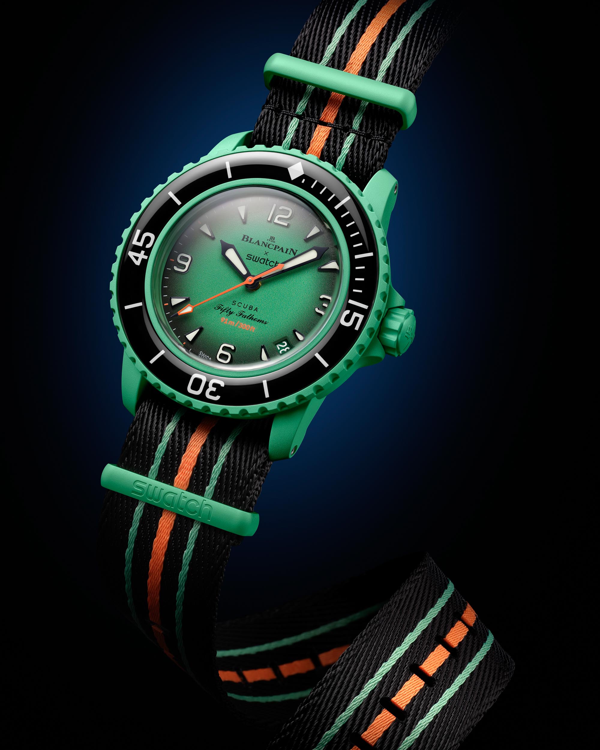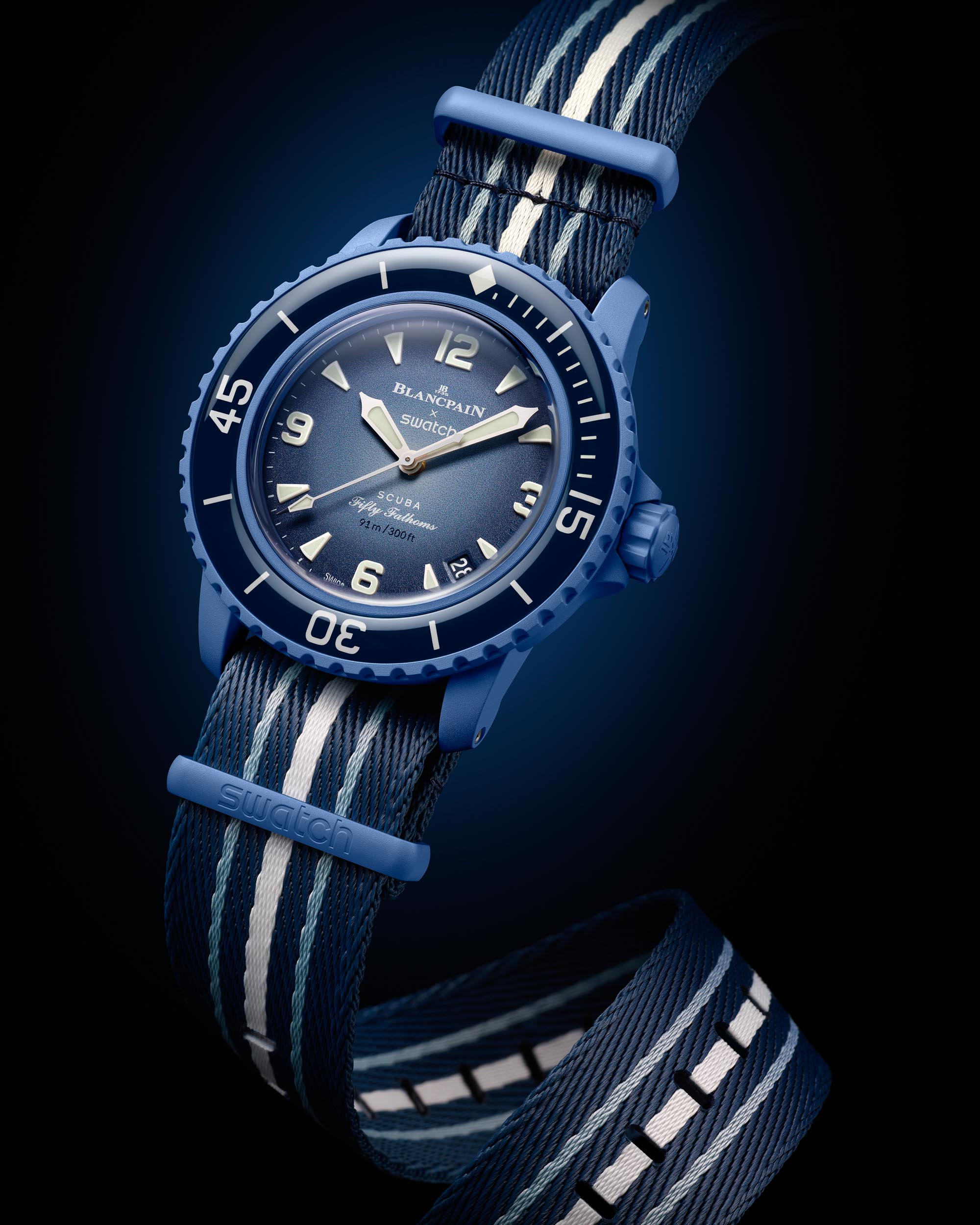 The new Blancpain x Swatch watches also have a glass-like diving bezel with real lume underneath, and the side of each case opposite the crown has the Swatch name in place. On Blancpain’s Fifty Fathoms, the Blancpain nameplate is there instead.