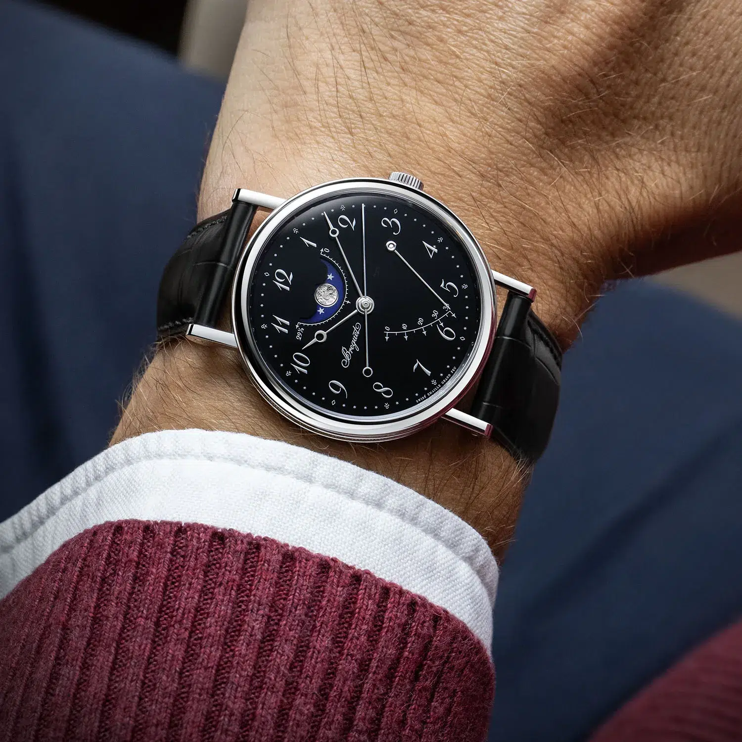 The other offering, the Classique 7787PT/2N/9VU, is quite similar. This one’s slightly more complex than the 5177, but the asymmetrical dial has been laid out based on designs from Breguet himself but updated for 2024. As well as the three hands and the date of the 5177, we’re also treated to an offset power reserve indicator featuring a super-thin hand and a realistic moonphase display. Also, like the 5177, the watch has a platinum case featuring thin welded lugs and coin-edging, a Breguet hallmark. The case measures 39mm x 10.3mm, is also 30m water resistant, and comes on a black leather strap like the 5177 although this one has a platinum folding clasp whereas the 5177 has a platinum pin buckle.