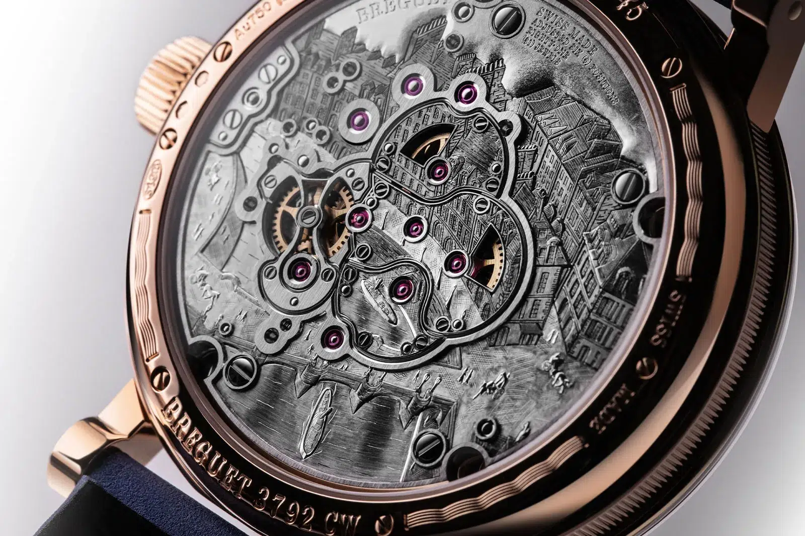 Naturally, this is incredibly complex and difficult to produce. The calibre 588 N not only has to perform all the functions I’ve just described, but all of the 738 individual components need to be able to withstand bumps and knocks just like any other watch. Okay, maybe not to the same extreme as a Tudor Black Bay might, but it wouldn’t be of any use to anyone if it fell apart at the first hurdle. both the balance wheels in the tourbillons beat at 2.5Hz, and this manually wound movement has a power reserve of around 50 hours. Perhaps the most striking part of the movement can be found around the back of the watch, which features an engraving of an aerial view of number 39 Quai de l’Horloge in Paris, which is where Abraham-Louis Breguet’s workshop was based. Everything, right down to the windows on the buildings and the figures of people in the streets, has been meticulously finished and rhodium plated.