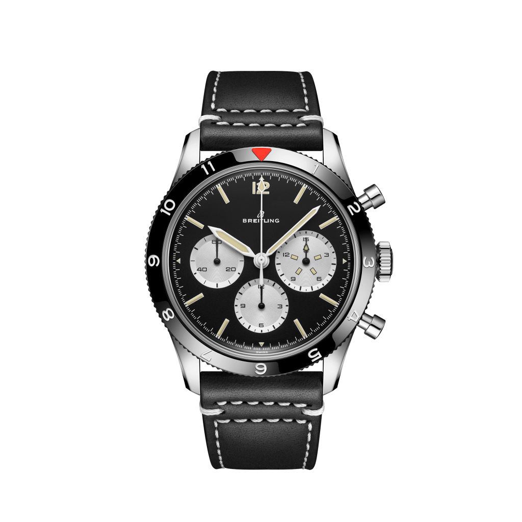 The AVI Ref. 765 1964 Re-Edition has a simplified and classic design with a black amorphous diamond-like carbon-coated steel bezel and a hand-wound column-wheel, vertical clutch Breitling Manufacture Caliber B09.