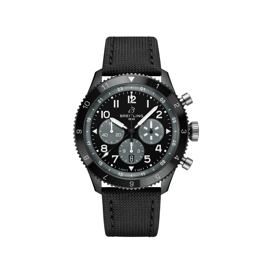 The Super AVI “Mosquito Night Fighter” has a black ceramic case, a COSC-certified Breitling Manufacture Caliber B04, and a titanium and sapphire display caseback.