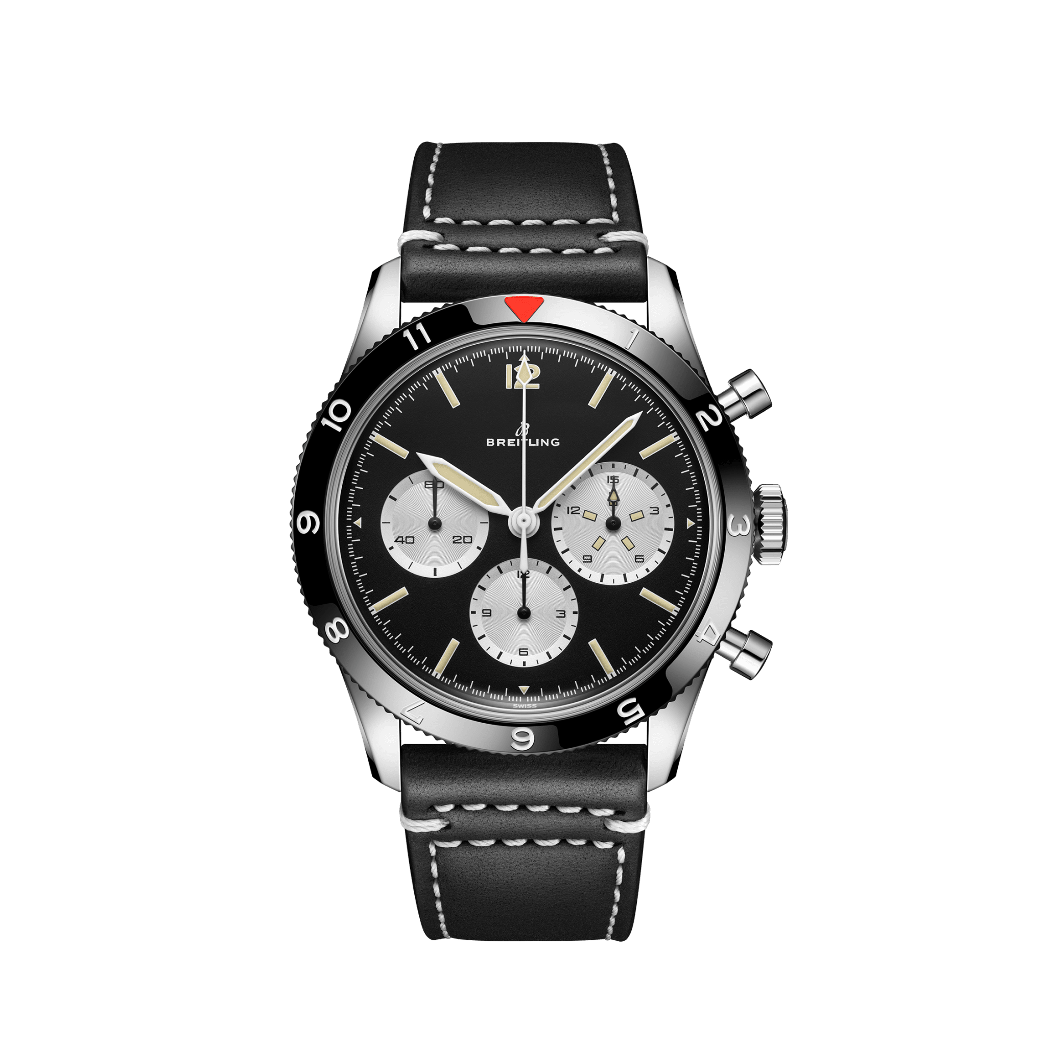 The AVI Ref. 765 1964 Re-Edition has a simplified and classic design with a black amorphous diamond-like carbon-coated steel bezel and a hand-wound column-wheel, vertical clutch Breitling Manufacture Caliber B09.