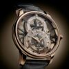 The same is true with the chronograph, showing three sketched sub-dials with a 30-minute counter, small seconds and independent second-time zone. Everything is traditionally monochromatic and It’s a fascinating look “behind the scenes” of two incredible watch designs. Human artistry, not computer rendering. The hour and minute hands are open-worked and all are black PVD treated on both dials. As expected, there’s no lume.
