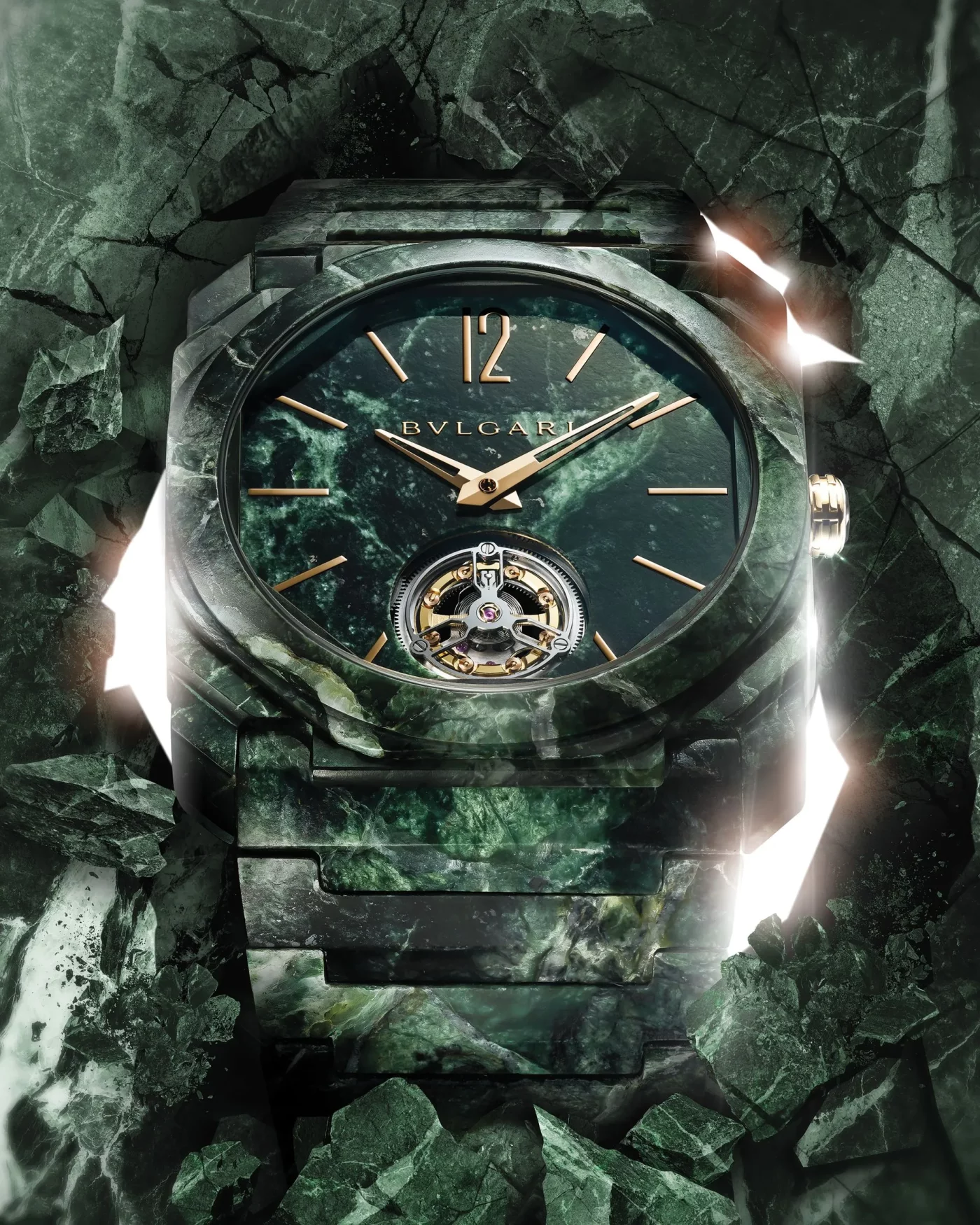 Bulgari is no stranger to creating innovative and groundbreaking watches, and their latest creation, the Octo Finissimo Tourbillon Marble edition etches the notion in stone, marble to be specific. This one-of-a-kind watch is made from a layer of 0.5mm of Verde di Alpi green marble that has been carefully applied to a DLC titanium case and bracelet.