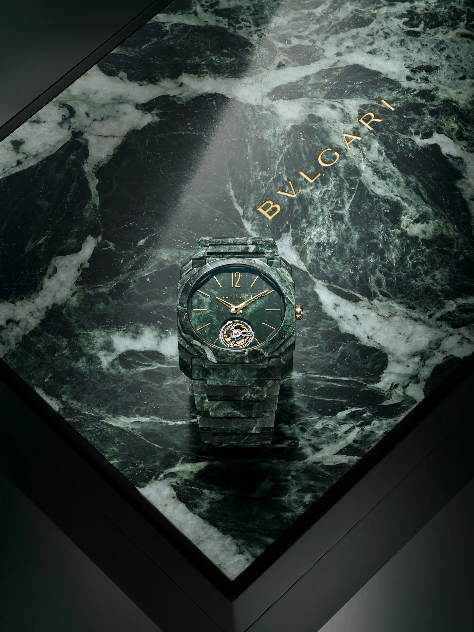With the Octo Finissimo Tourbillon range, Bvlgari has reached a milestone in the development of ultra-thin watches with a major complication: its 1.95mm thin movement makes this flying Tourbillon the slimmest on the market since 2013. The 3Hz BVL 268 manual movement with flying tourbillon is visible through the dial, which is also made from a layer of Verde di Alpi green marble. The inspiration behind the piece came from ancient times when marble was featured in Roman architecture by the most skillful artists of all time.