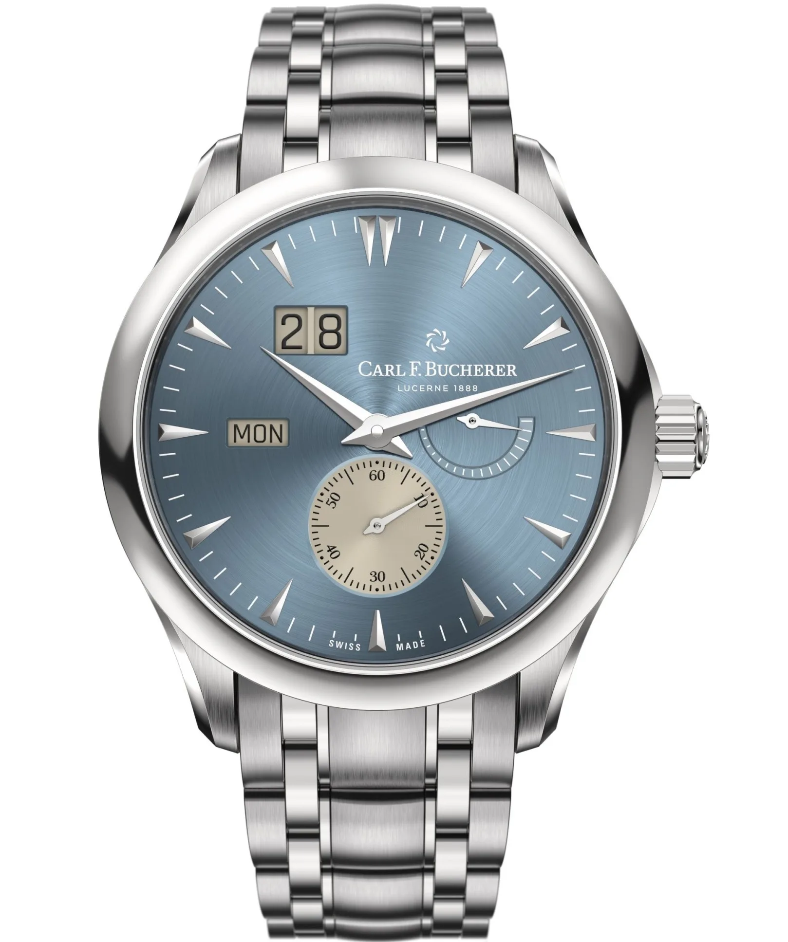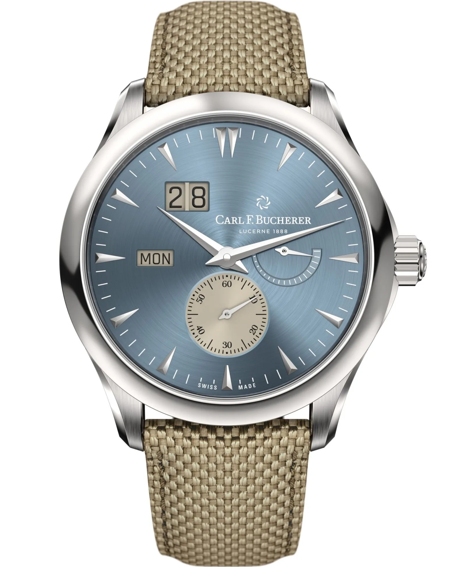 The Manero line in Carl F. Bucherer’s catalogue has no shortage of timepieces with a peripheral winding mechanism. The Carl F. Bucherer Manero Peripheral BigDate is a new addition to that lineup. Manero BigDate comes in two color variations of the dial and the registers, one has a light blue dial with a small seconds indicator in beige located at 6 o’clock position, a day-of-the-week aperture located at 9 o’clock position and the big date window at 10 o’clock.