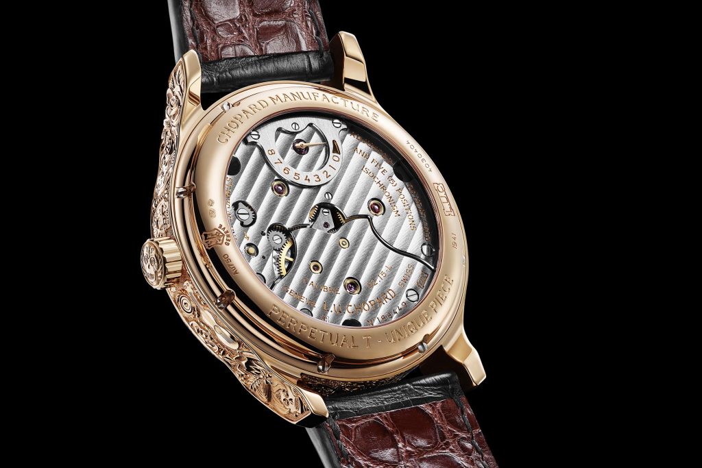 As well as being very well made and decorated, this movement is also very practical. Chopard uses a system of four spring barrels which it calls Quattro to extend the run time of its complicated watches. This one is hand wound, but only needs to be wound up once every nine days! Bear in mind there that although the power reserve indicator only goes up to 8 days, Chopard adds in an extra day just in case. It’s also a COSC certified chronometer, too, which verifies its accuracy and is something that Co-President Karl Friedrich Sheufele is very attached to.