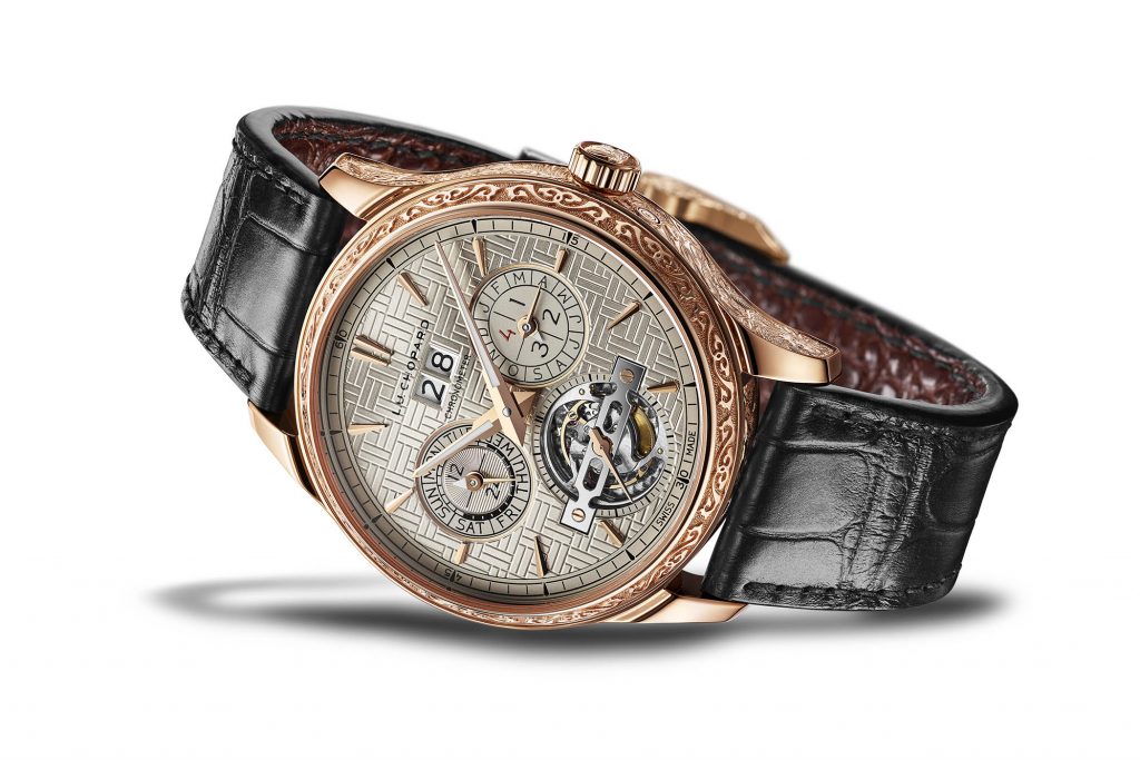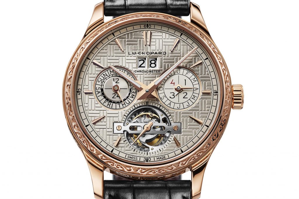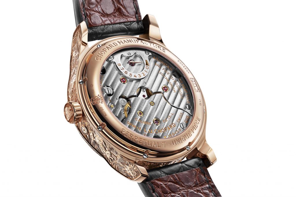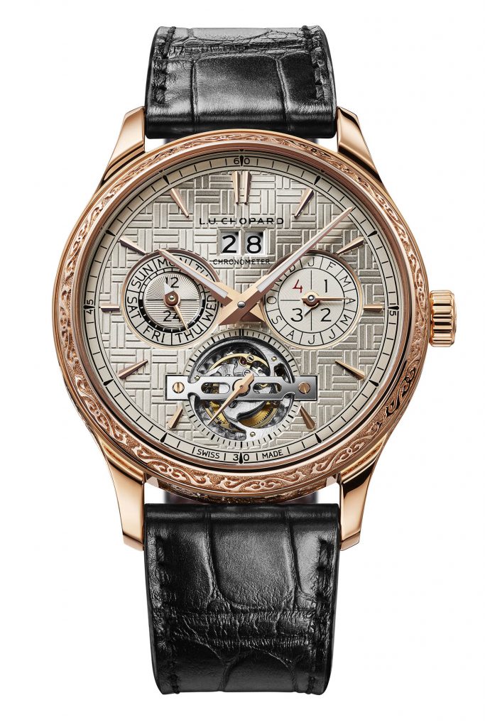 Inside the case is the calibre 02.15L which is 33mm in diameter and made of 353 components. As I mentioned above, this watch features a perpetual calendar with a big date just under the Chopard logo at 12 O’clock, and the tourbillon with a seconds hand is exposed at 6. Powering the tourbillon and perpetual calendar are 4 barrels which extend the power reserve to 9 days. This movement has been awarded COSC chronometer status and the Geneva Seal, though the caseback is quite conservative with a small power reserve indicator and Geneva waves. L.U.Chopard likes to tease us with tantalisingly complicated movements that it then hides, I hope there’s a full-on skeleton piece one day.