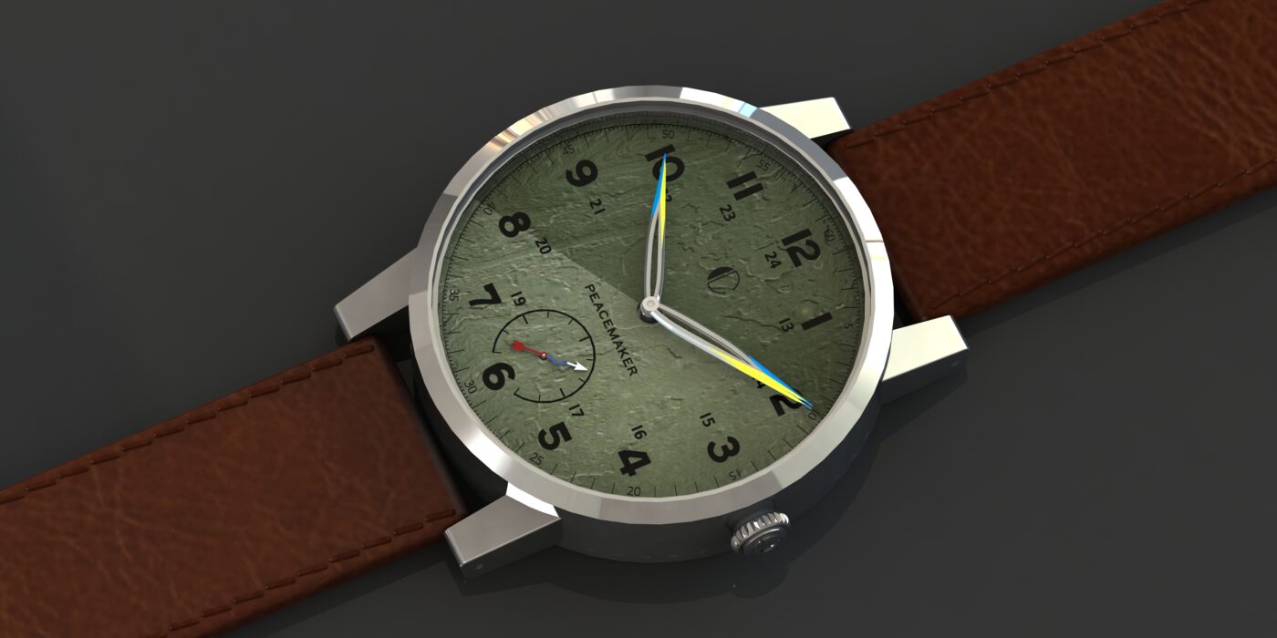 - Second, as it so happens, Ukraine is commonly referred to as the breadbasket of Europe. And as seen with the impacts of Russia’s shipping blockades on grain exports – it turns out Ukraine is the breadbasket for not just Europe but much of the surrounding developing world. So the plowshare motif takes on yet further meaning within the Russia-Ukraine Edition for this Peacemaker series watch collection. And is also the reason we thought to then add additional Ukranian flag colours to these hands.