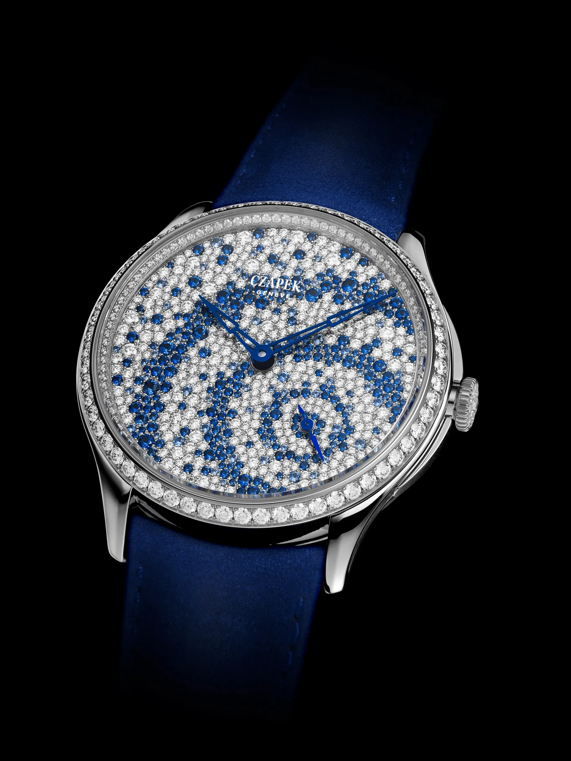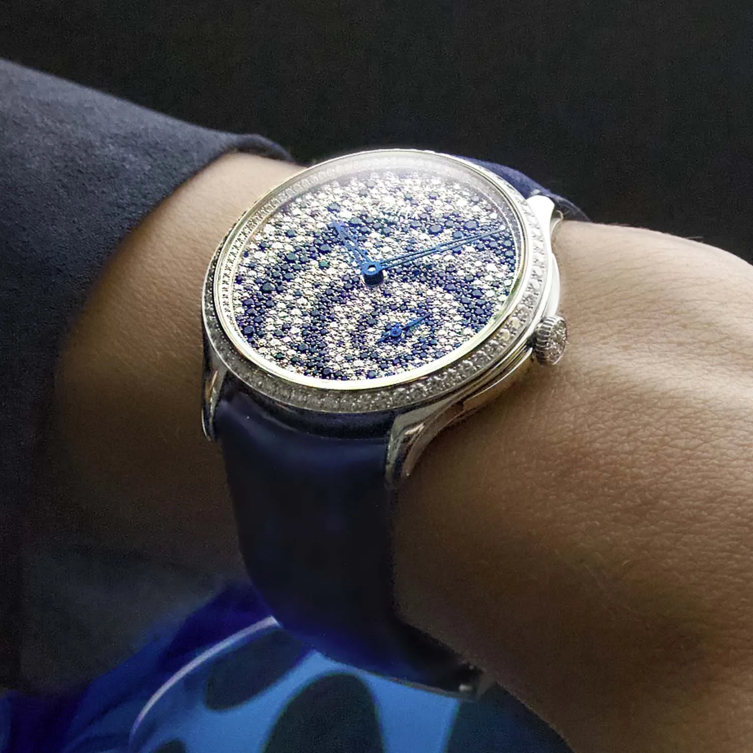 The actual visual drama lies on the dial. Forged in white gold and snow-set by AB Products, it brims with 679 round-cut gemstones, of which 360 are diamonds and 319 are blue sapphires.