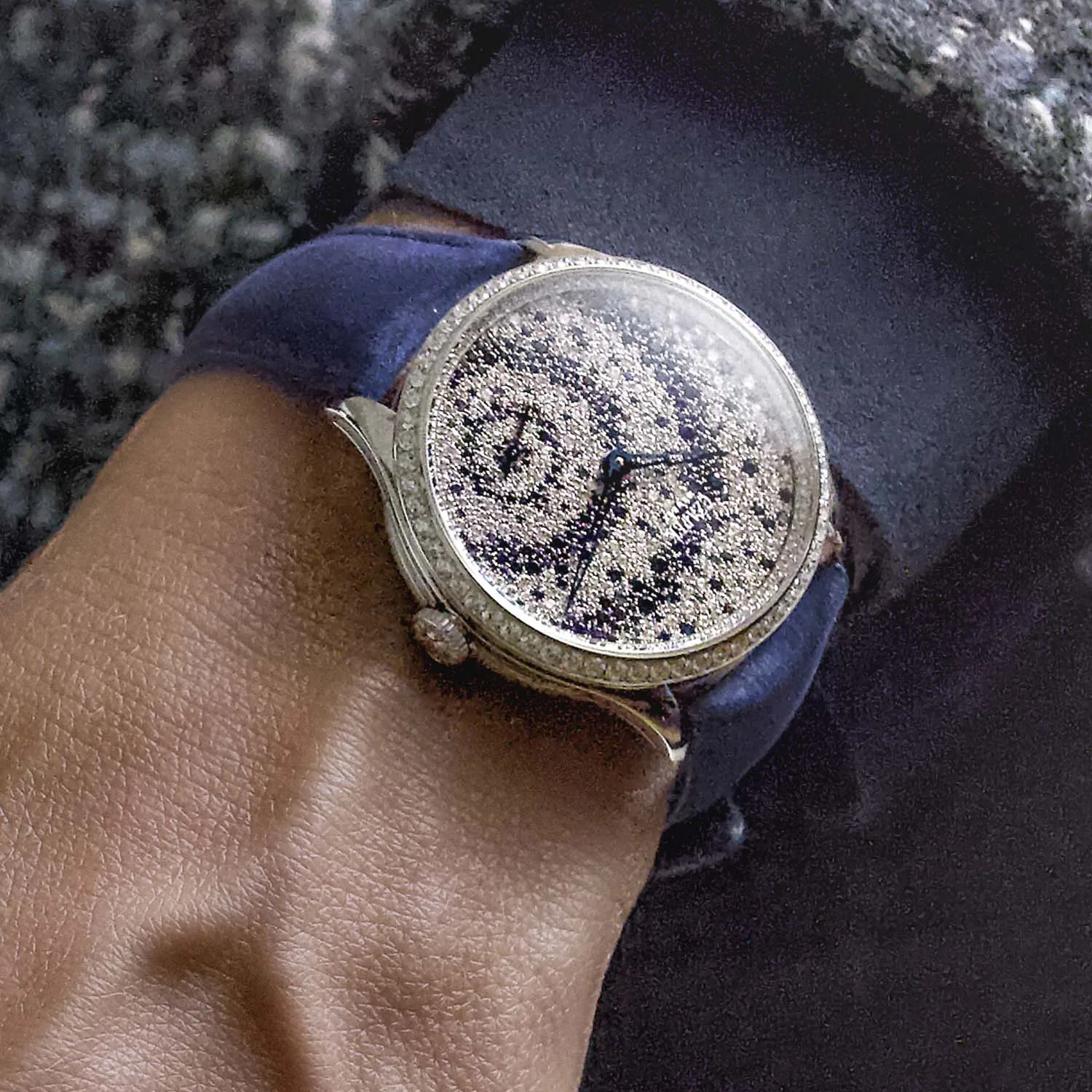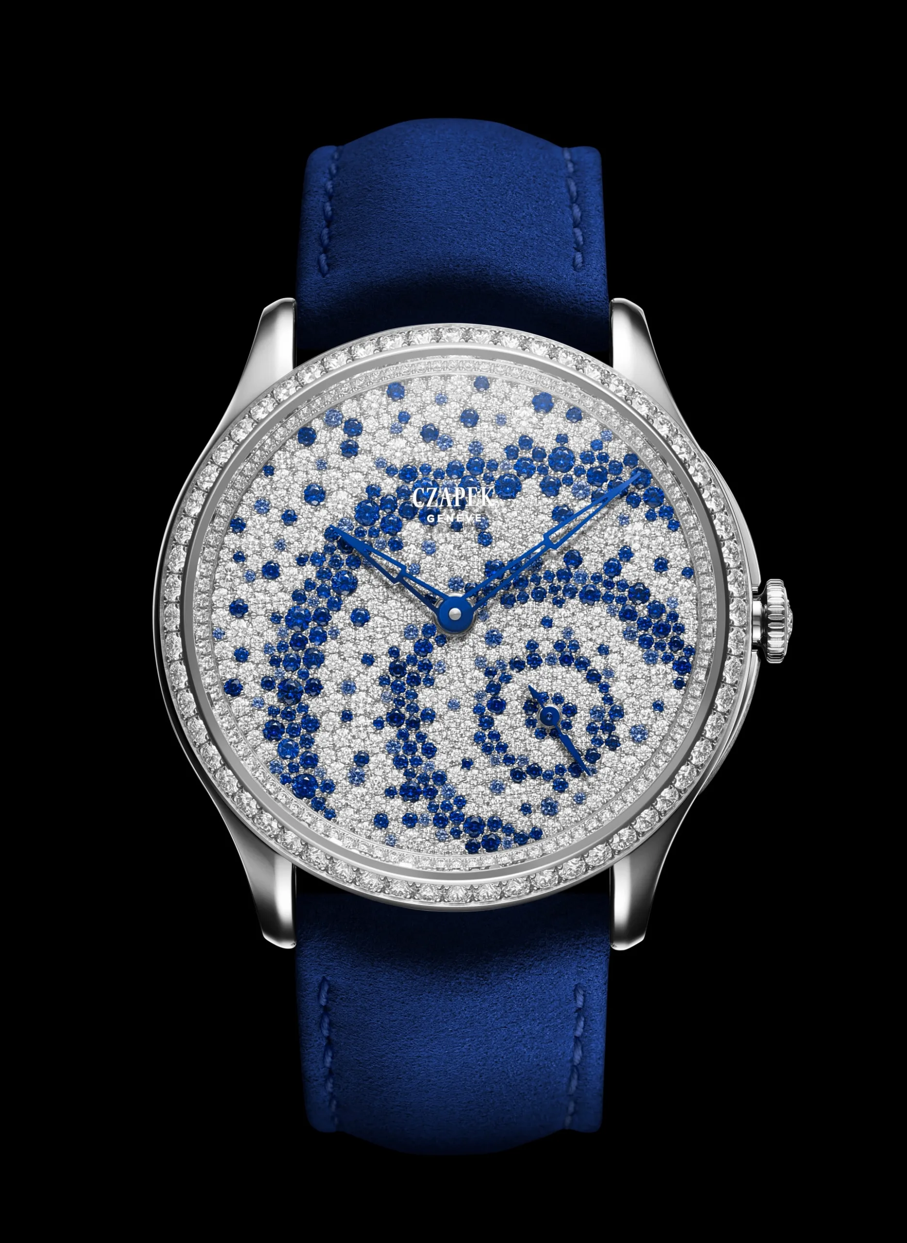 Czapek’s latest gambit, the Promenade Diamond Drops and struts onto the horological stage with no shortage of sparkle. It takes its cues from the subtle art of fluid motion, this curious creature of haute horlogerie conjures the ephemeral moment a water droplet disturbs a placid surface. Dressed to the nines in diamonds and sapphires, it channels an icy glamour.