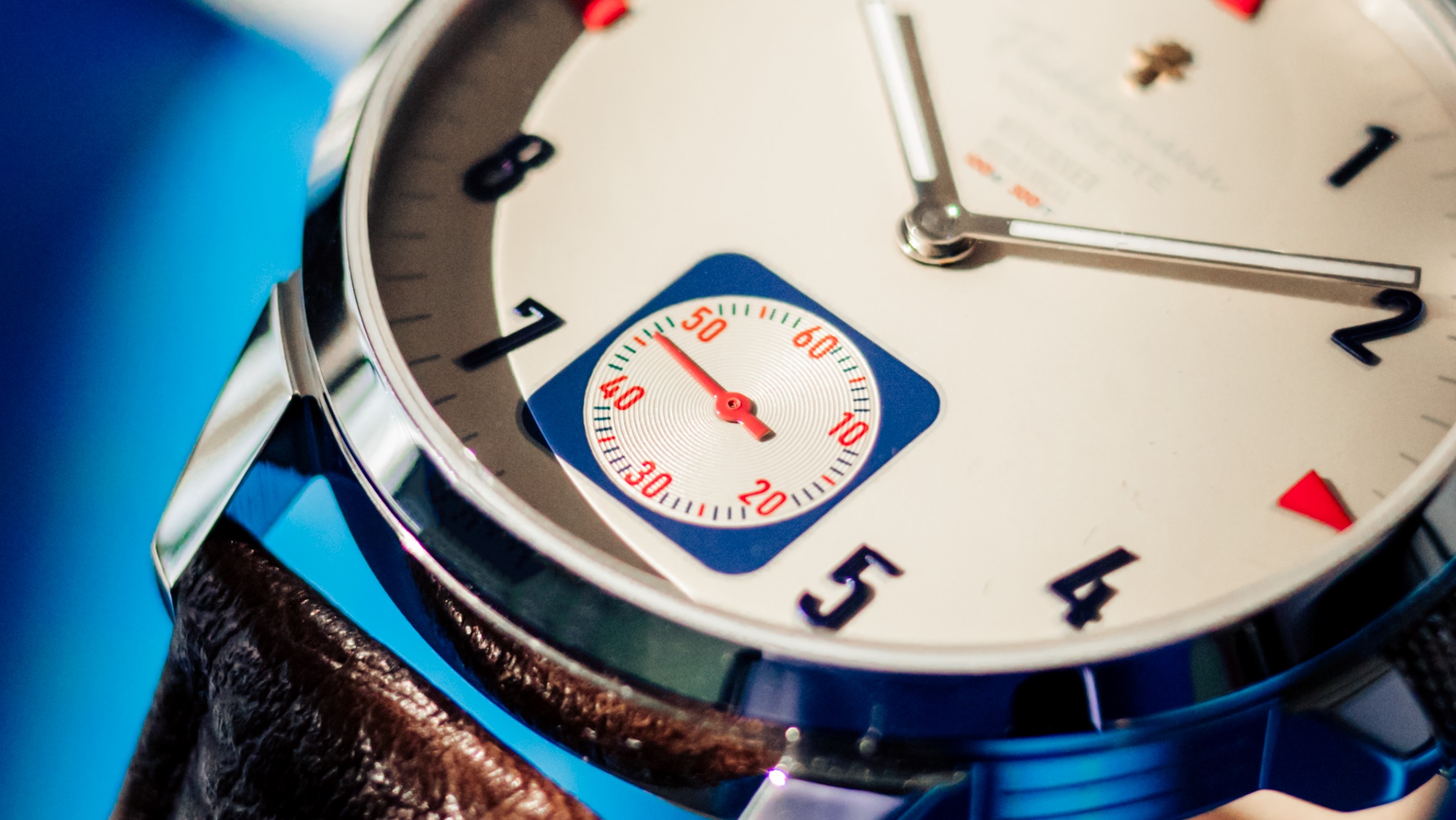 The dial has another German reference with the square small seconds sub-dial at 6 o’clock. It represents Munich’s independent streak and the city squares where Münchners come together. Within the square is a nice circular snailed pattern. Just below 12 o’clock is an applied Cross of Lorraine – a two-barred cross with a long history representing human rights and the opposition to tyranny (more on this later).