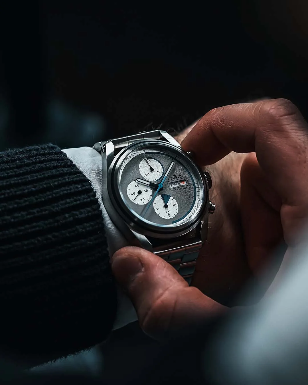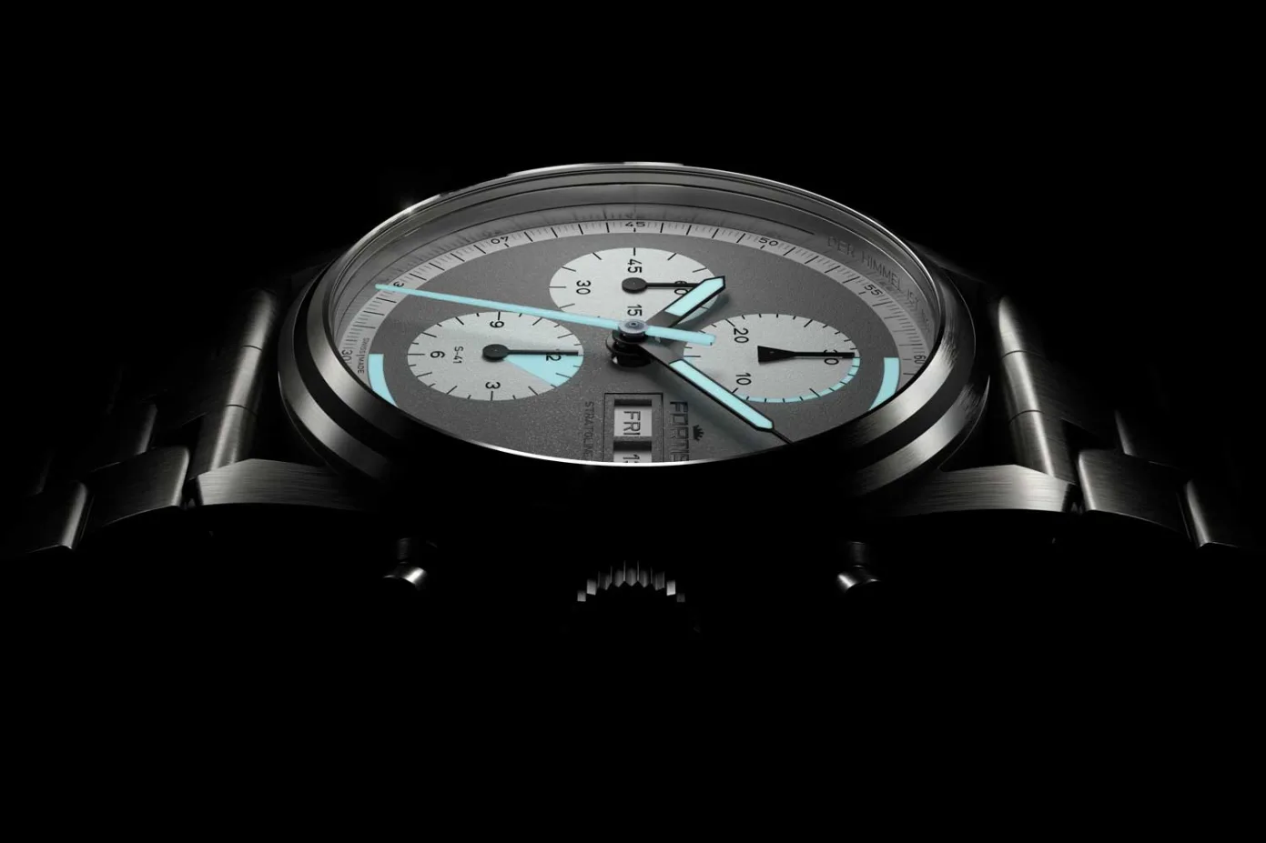 There are three textured dial options – Cosmic Gray with a dark grey dial and black sub-dials, White Dust with a white dial and sub-dials, and Cool Gray with a light grey dial and off-white sub-dials. Fortis calls the grained texture a “Dust Dial” and they’re very anti-reflective. The tri-compax dials have a 30-minute counter at 12 o’clock, 12-hour counter at 6 o’clock and small seconds at 9 o’clock, and a split day/date window sits at 3 o’clock. The hour, minute and chronograph seconds hands are coated with Super-LumiNova X1, along with the first half of both the dial’s outer perimeter and 30-minute counter sub-dial. The first 1.5 hours on the 12-hour counter are also coated in lume. In regular light, those dial areas are blue and symbolize the different phases of Virgin Galactic’s stratospheric flight – the 1.5-hour climb phase, 15 minutes of zero gravity and the boost phase, which can be up to 90 seconds. The overall aesthetic is stripped down and all business, and really fits the spacefaring vibe. This is reinforced with an engraving at the top of the vertical ring on the dial’s outermost perimeter, “Der Himmel ist nicht das Ende der Welt.” This translates to “Sky is no limit.”