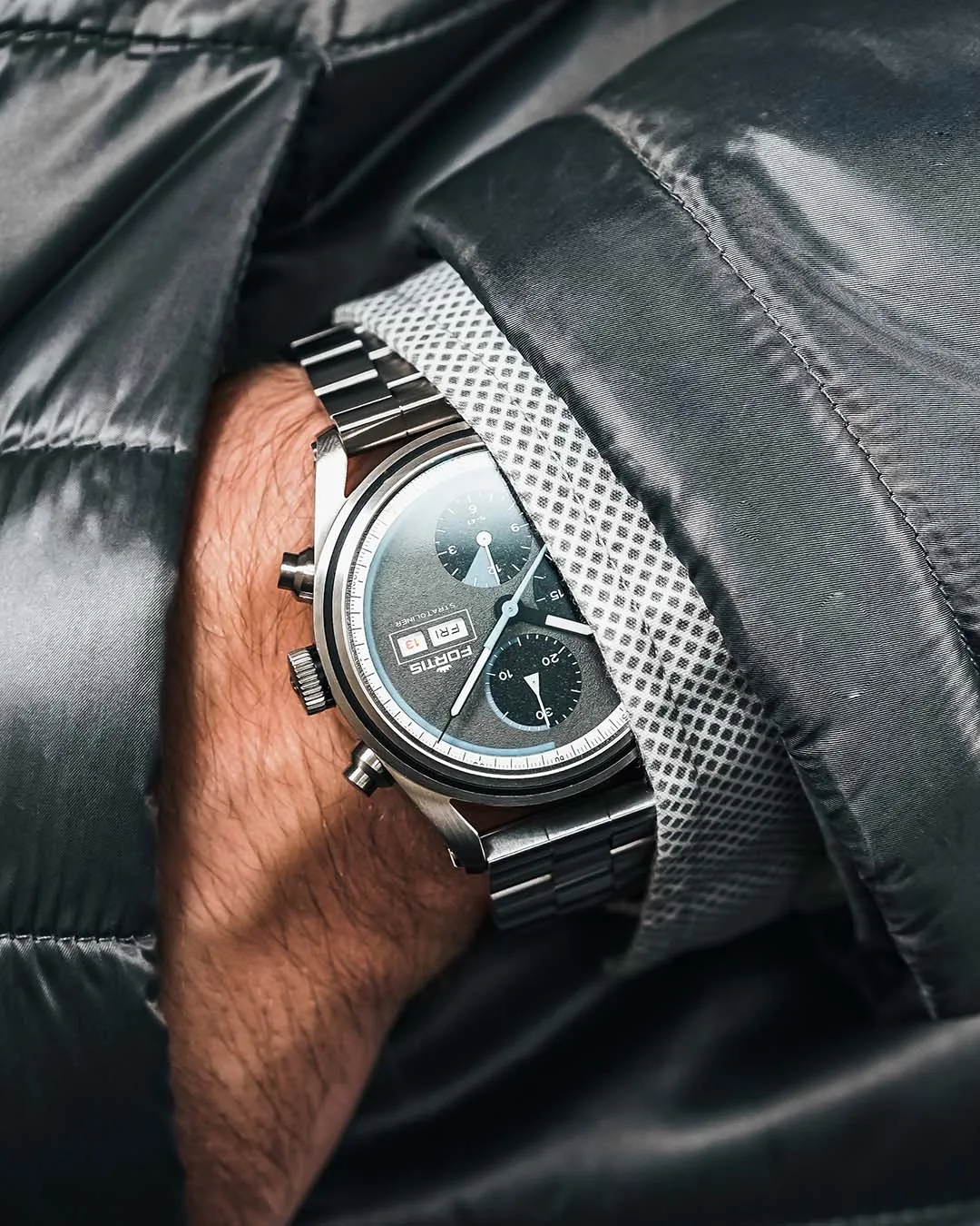 Let’s take a closer look at the Werk 17. It was built in partnership with La Joux-Perret, so it’s more of a proprietary movement than in-house. Regardless, it’s very impressive with reinforced bridges and tangential micro screw regulation for added robustness if/when launched into space. It’s a little gimmicky as space travelers generally remain within a ship or space station without actually venturing into the black vacuum. Perhaps future moon walkers will put some through their paces. After retrieving the movements from the edge of space (thanks to the Swedish Space Corporation) only a couple had issues and it helped the brand tweak lubricants and other specifications to make the watches truly space-ready. Seen from the exhibition case back, the finishing is industrial with a dark grey matte finish and dedicated aperture highlighting the column wheel. Later this year, Fortis plans to launch a Werk 17 into open space for the ultimate validation. As far as specs, the (automatic) integrated column wheel chronograph beats at 4Hz with a 60-hour power reserve.
