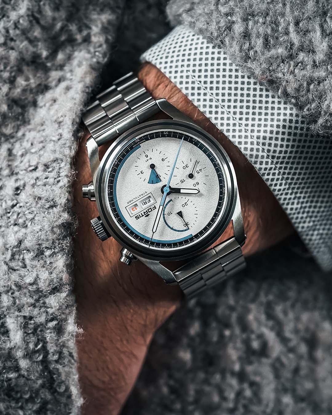 There are three textured dial options – Cosmic Gray with a dark grey dial and black sub-dials, White Dust with a white dial and sub-dials, and Cool Gray with a light grey dial and off-white sub-dials. Fortis calls the grained texture a “Dust Dial” and they’re very anti-reflective. The tri-compax dials have a 30-minute counter at 12 o’clock, 12-hour counter at 6 o’clock and small seconds at 9 o’clock, and a split day/date window sits at 3 o’clock. The hour, minute and chronograph seconds hands are coated with Super-LumiNova X1, along with the first half of both the dial’s outer perimeter and 30-minute counter sub-dial. The first 1.5 hours on the 12-hour counter are also coated in lume. In regular light, those dial areas are blue and symbolize the different phases of Virgin Galactic’s stratospheric flight – the 1.5-hour climb phase, 15 minutes of zero gravity and the boost phase, which can be up to 90 seconds. The overall aesthetic is stripped down and all business, and really fits the spacefaring vibe. This is reinforced with an engraving at the top of the vertical ring on the dial’s outermost perimeter, “Der Himmel ist nicht das Ende der Welt.” This translates to “Sky is no limit.”