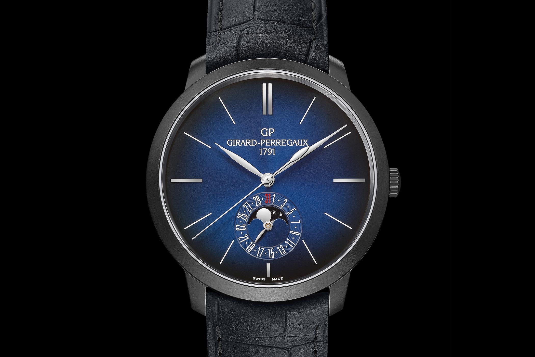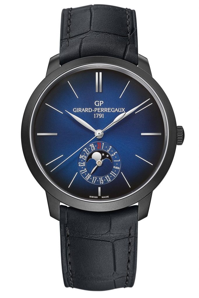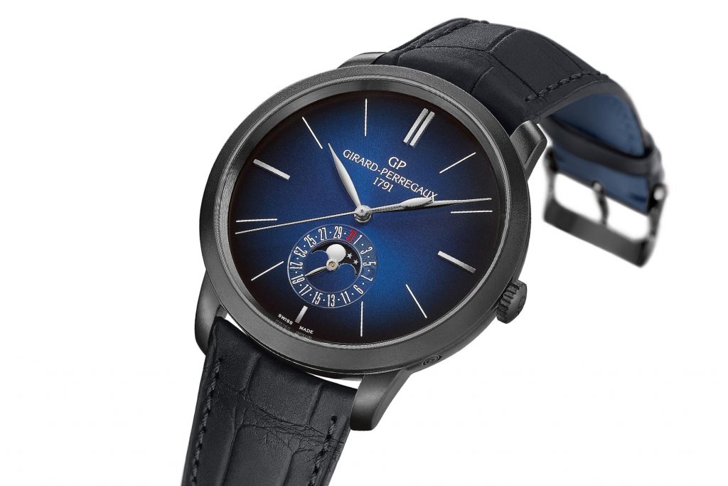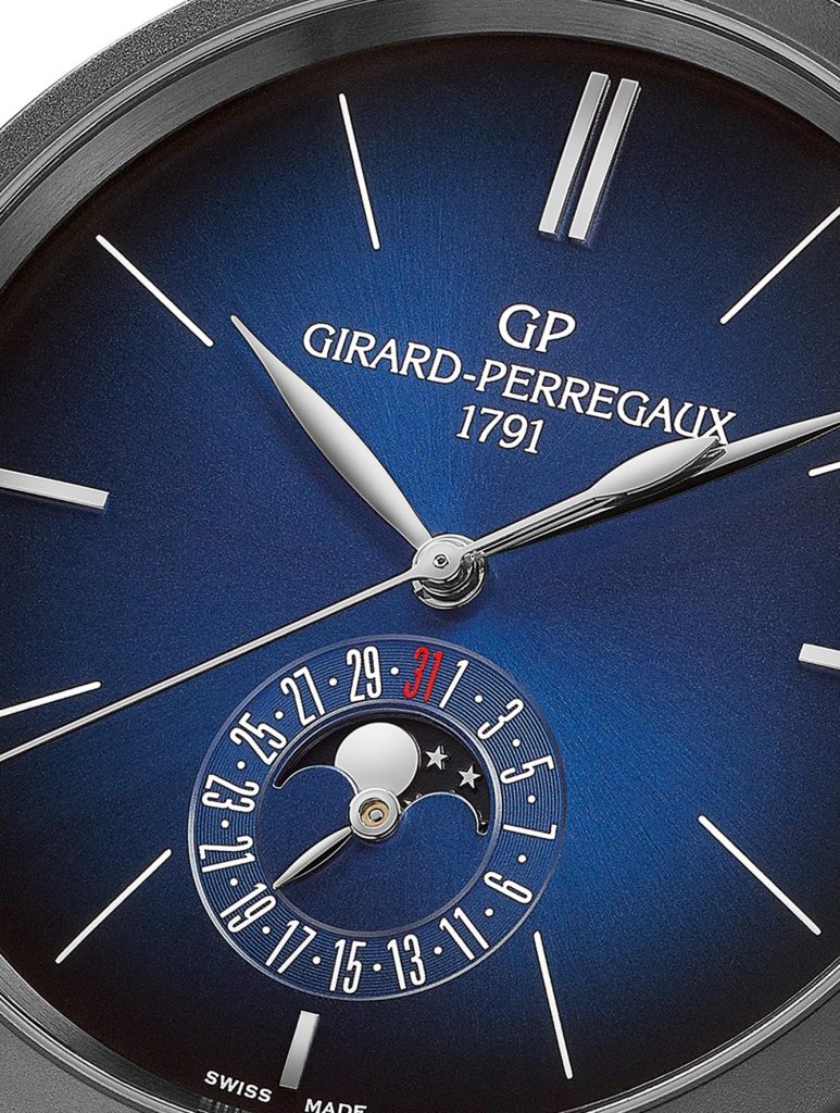 The calling card of this watch is its gradient blue dial. It starts with a deep shade of blue at the center and attains an almost blackish hue towards the outer edges making for a visually engaging experience. Providing a nice contrast against the blue backdrop are polished and applied baton-style hour markers and an elegant looking leaf-shaped handset. Another interesting detail on this watch is the execution of the date complication. Instead of a more commonly used window at 3, Girard-Perregaux has gone with a sub-register at 6 which not only displays the date but also incorporates a discreet moon phase display. Adding some pop of color to the dial is the 31st of the month highlighted in red.
