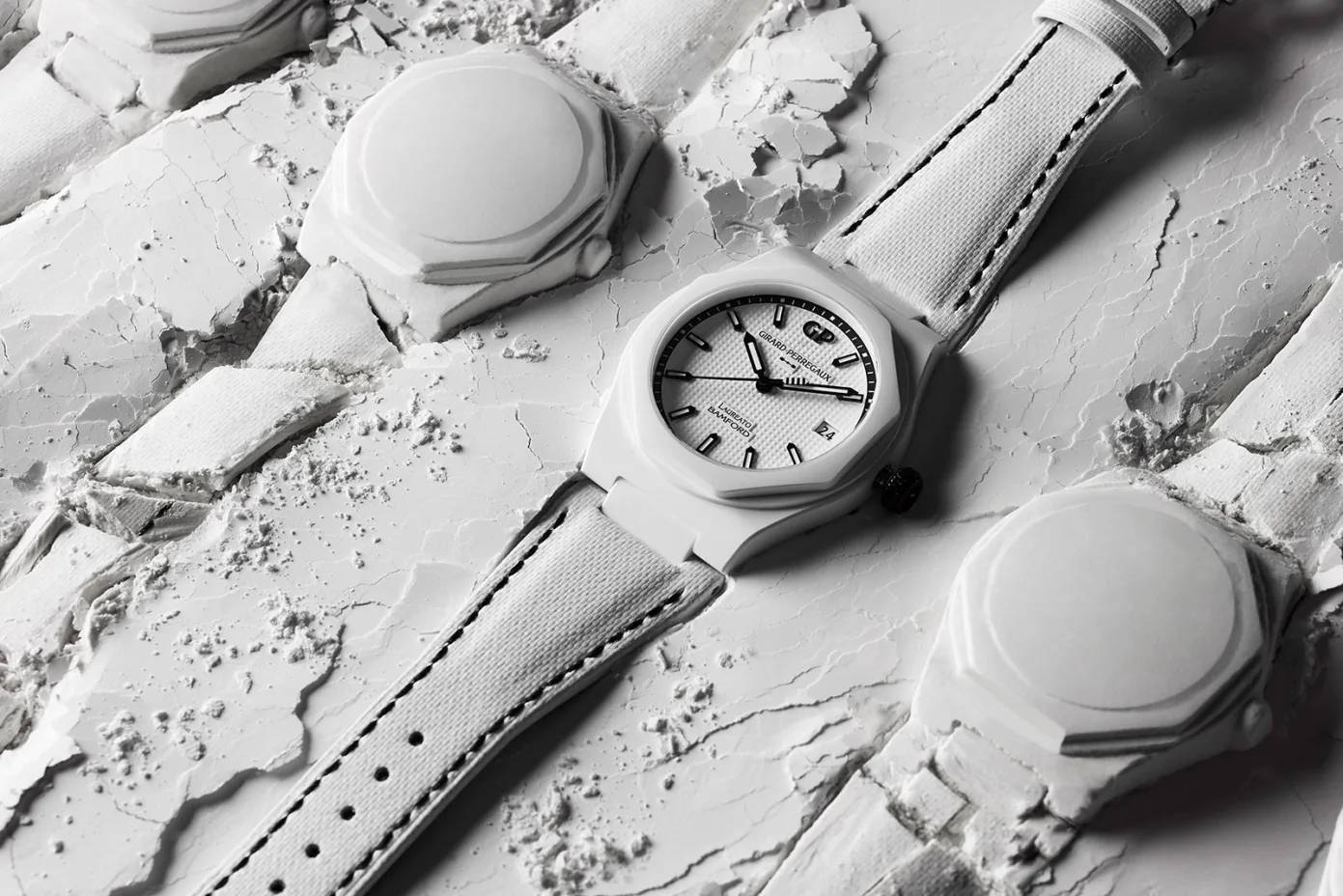 Since they realised that they’d need to get radical with the Laureato, Girard Perregaux has been making some wild additions to the catalogue. The latest comes courtesy of a connection with Bamford and features a snowy white case made of ceramic. White ceramic on a wristwatch is both brave and rare. Thinking back to Omega’s White Side of the Moon with its white ceramic case and white leather strap, it wasn’t well-received at all.