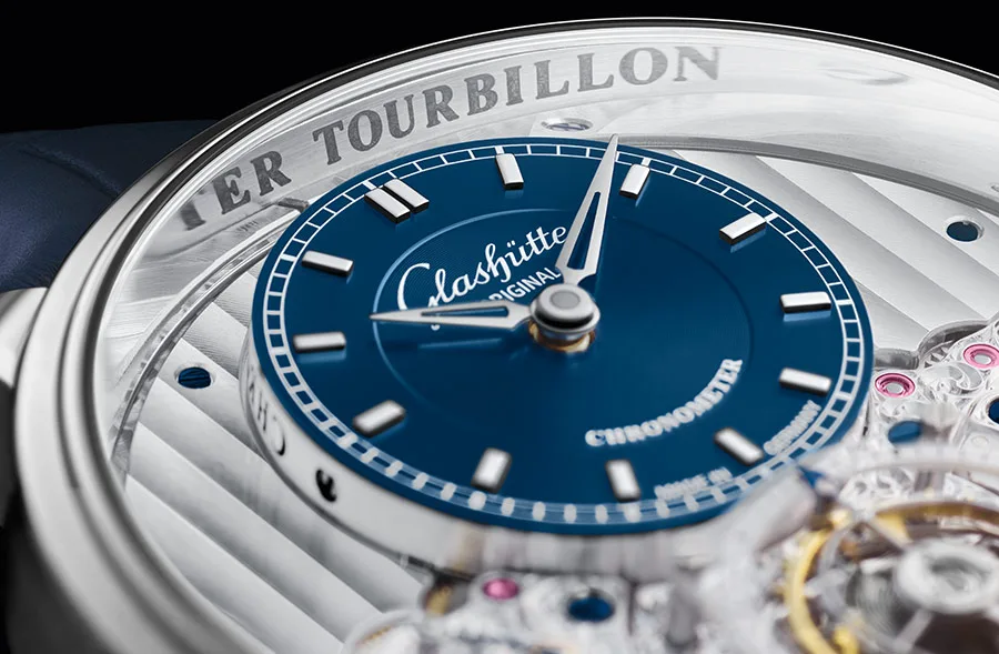 Glashütte Original present to us a new model in the Senator range, the Senator Chronometer Tourbillon, which promises to take tourbillon accuracy to new heights. You’d be forgiven for thinking this was a brother to the PanoMatic Inverse watch which features most of the workings visible on the dial side. In that respect, this watch is similar. It could even be a sibling to the Pano if it were in the same collection.