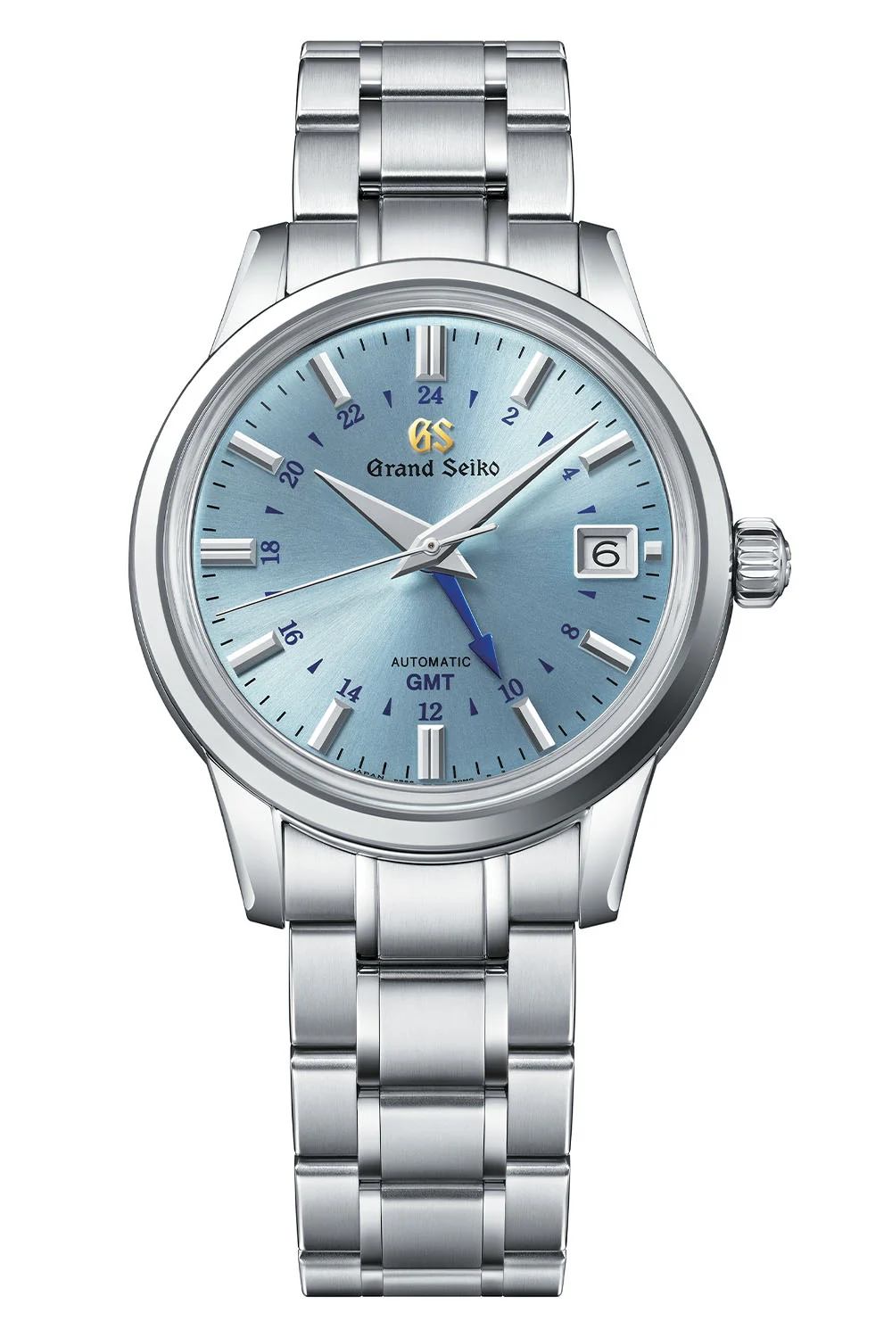 The two new watches feature a 9S calibre with GMT function and date added and come in two flavours. The first is from the Elegance collection, reference SBGM253, meaning it has a brushed/polished 39.5mm stainless steel case with a matching bracelet. It comes with a light blue sunray-finished dial with sharp markers and sharper hands. Inside is the self-winding calibre 9S66 which runs at 4Hz for a total of 72 hours. The rotor has had a special treatment to make it blue which looks very cool. This one is priced at €6300 and will be available soon through Grand Seiko boutiques and certain retailers.