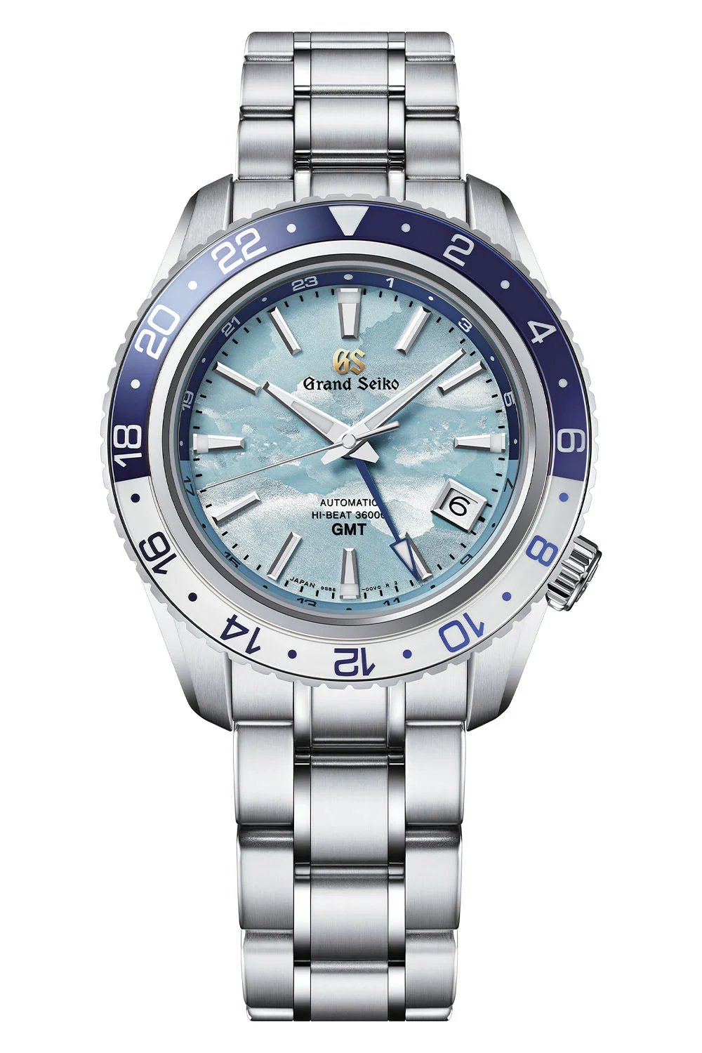 The second piece is much more sporty as it hails from the Sport collection, SBGJ275. It comes in at 44.2mm across and also has a stainless steel case with a steel bracelet. It also has a GMT bezel with a sapphire crystal insert and blue and white markings which are modern and classy. The markers also match the blue of the dial which has a cloud formation type finish. The blue on both of these watches is said to represent the sky over Mount Iwate, which is located in the HonshÅ« prefecture of northern Japan. The artisans in Grand Seiko’s studio can clearly see it from their workshop, which inspired these watches.