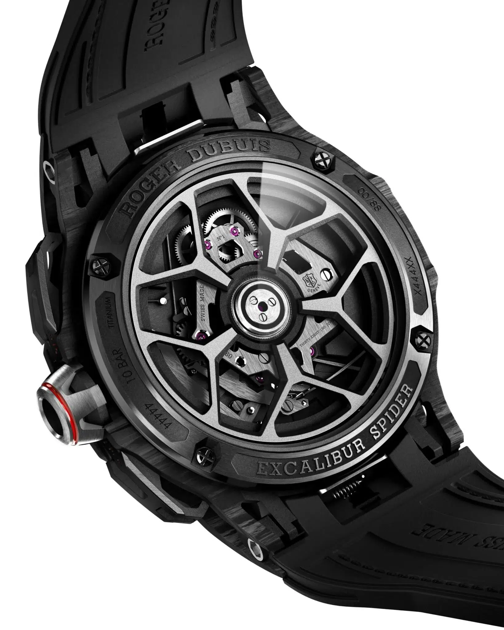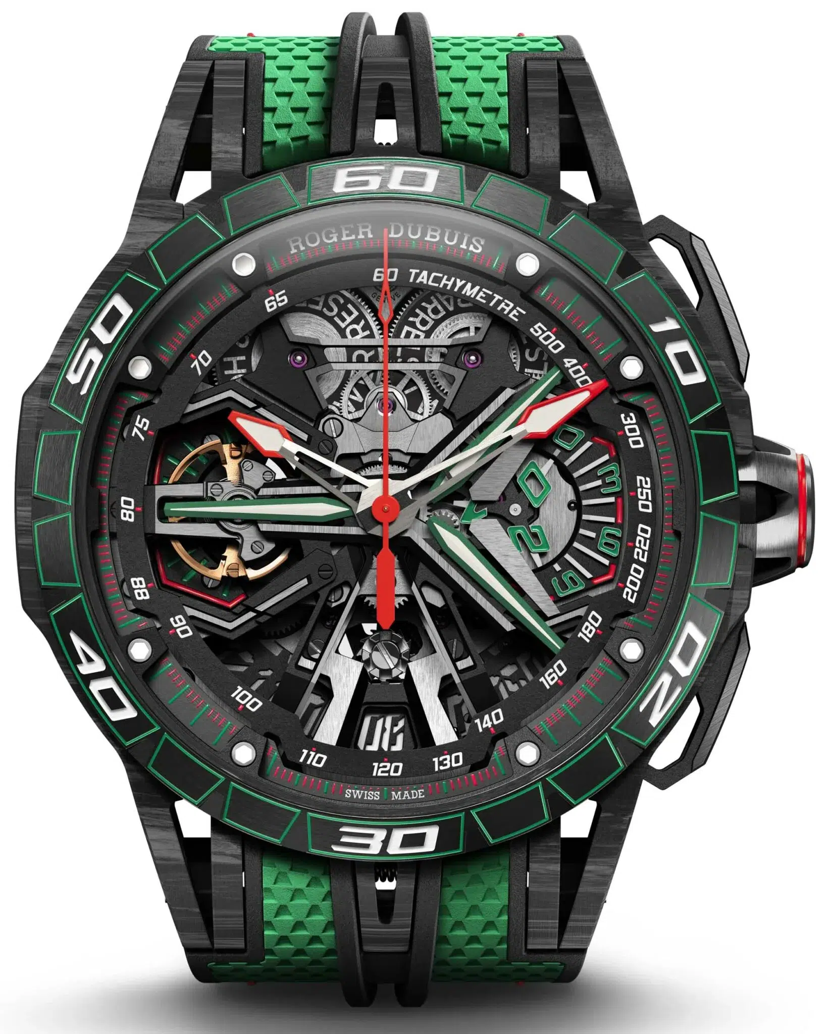 The newest addition to Roger Dubuis’ collection, the Excalibur Spider Flyback Chronograph, is a true testament to their unconventional approach. The 45mm case, crafted from carbon, is a bold departure from traditional materials. Topped with a black ceramic bezel and unique notches, it’s a design that’s sure to turn heads. The 100m water resistance and quick-release rubber strap with green inlays add a touch of practicality to this piece.