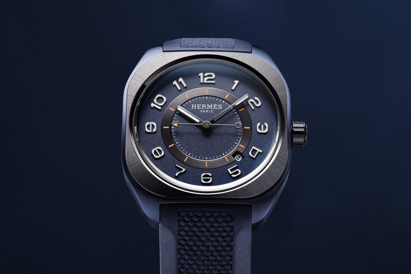 The new watch measures the same as the old one, and the case is 39mm x 39mm. It’s hard to describe precisely what kind of square it is as the proportions seem a little weird, the closest watch in this shape neighbourhood is probably the Cartier Santos. Hermès has undoubtedly been more daring with its case design, though, as the central part of the titanium case has been brushed, and then blue PVD coated. Meanwhile, the rounded square bezel is made of black ceramic and has been given vertical brushing. It’s attached to a textured rubber strap with titanium clasp and offers 100m of water resistance.