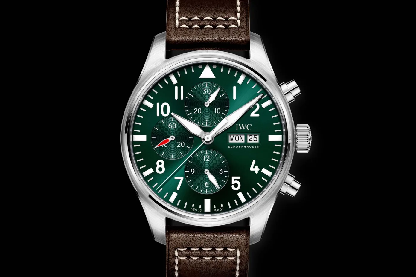 Initially launched to help pilots read the time inside the cockpit, the utilitarian and purposeful design of a pilot’s watch is still going strong after decades of existence and that is exactly what you get with the IWC Pilots Chronograph. Bold Arabic numerals characterize the dial and combined along with the sharp-looking sword style hands make for a highly legible dial. Being a chronograph there are 3 nicely executed sub-dials at 6, 9 and 12 to track the elapsed hours, running seconds and minutes. While the layout and other details look familiar, the major highlight of this watch is its British Racing Green color. While the Matt black shade on the regular version provides the watch a classic look, the deep emerald color along with its sunburst finish provides the watch a vibrant sparkle and gives it a distinctive visual appeal.