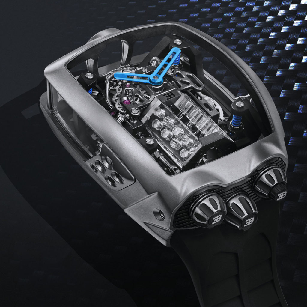 Like most other Jacob & Co. watches the Bugatti Chiron Tourbillon is more about the experience than just telling the time. Inspired by the Bugatti Chiron, the designers at Jacob and Co. decided to re-create the magic of the supercar by presenting a face that looks like the 1500 horsepower behemoth that powers the Chiron. The miniature depiction proudly shows off the pistons of Chiron’s V16, which by the way are not just dummies. To set them in action all you need to do is push the crown on the right-hand side, which turns the crankshaft, making the pistons move up and down like in a real combustion engine to create a dramatic visual impact. The engine setup also features two turbochargers that also spin when the engine is set in motion. It is also worth noting that while the visual drama is intriguing, it does not count tribute towards the timekeeping in any way.