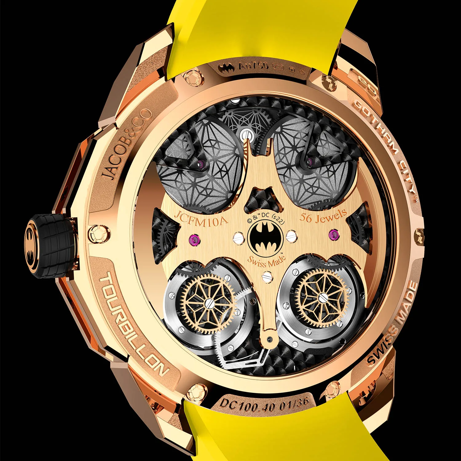 The new Jacob & Co. Gotham city black comes mated to a special black rubber strap with yellow edges. The upper section of the strap is made of ballistic nylon whereas, the lower section that touches the skin is made of yellow rubber. Both models are limited to 36 pieces with a retail price of USD220,000 for the Black DLC coated titanium variant and USD240,000 for the red gold variant.